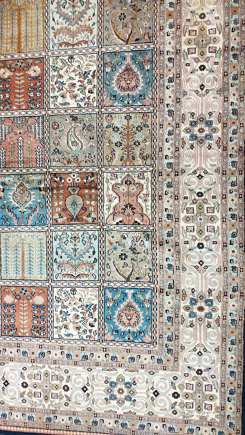 Dimensions : 367 x 270 cm -laine- Pays Pakistan - Épaisseur : 7 mm - Densité de nouage : 250.000 Nœuds au m² - Surface : 9.91 m² - Poids : 19.82 Kgs - Age : contemporain - Confection : Noué main - Forme : Tapis de salon - Type : Tapis Oriental