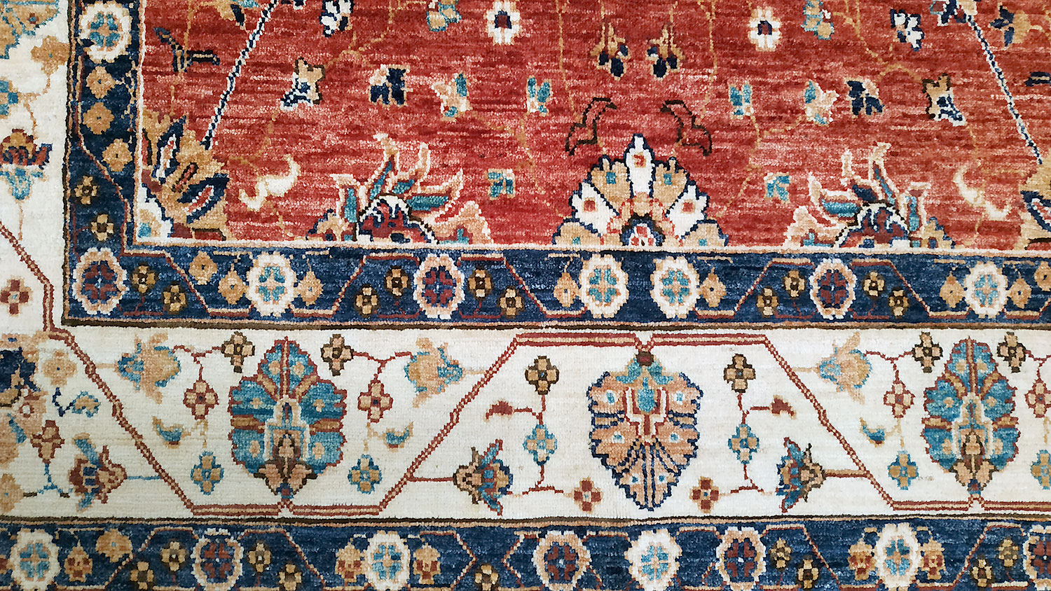 Dimensions : 215 x 146 cm -laine- Pays Afghanistan - Épaisseur : 9 mm - Densité de nouage : 200.000 Nœuds au m² - Surface : 3.14 m² - Poids : 9.42 Kgs - Age : contemporain - Confection : Noué main - Forme : Tapis de chambre - Type : Tapis Oriental