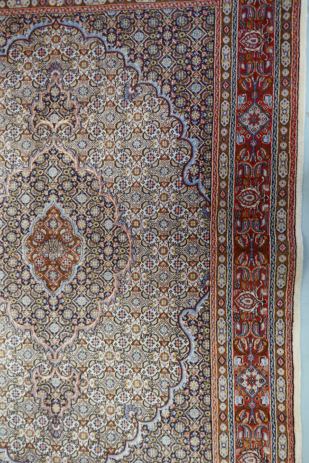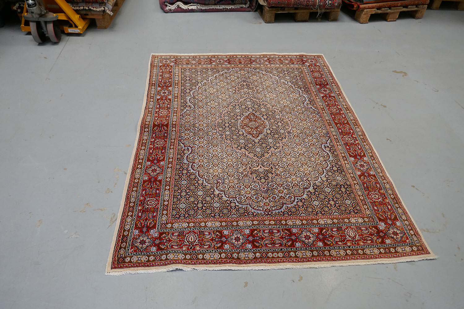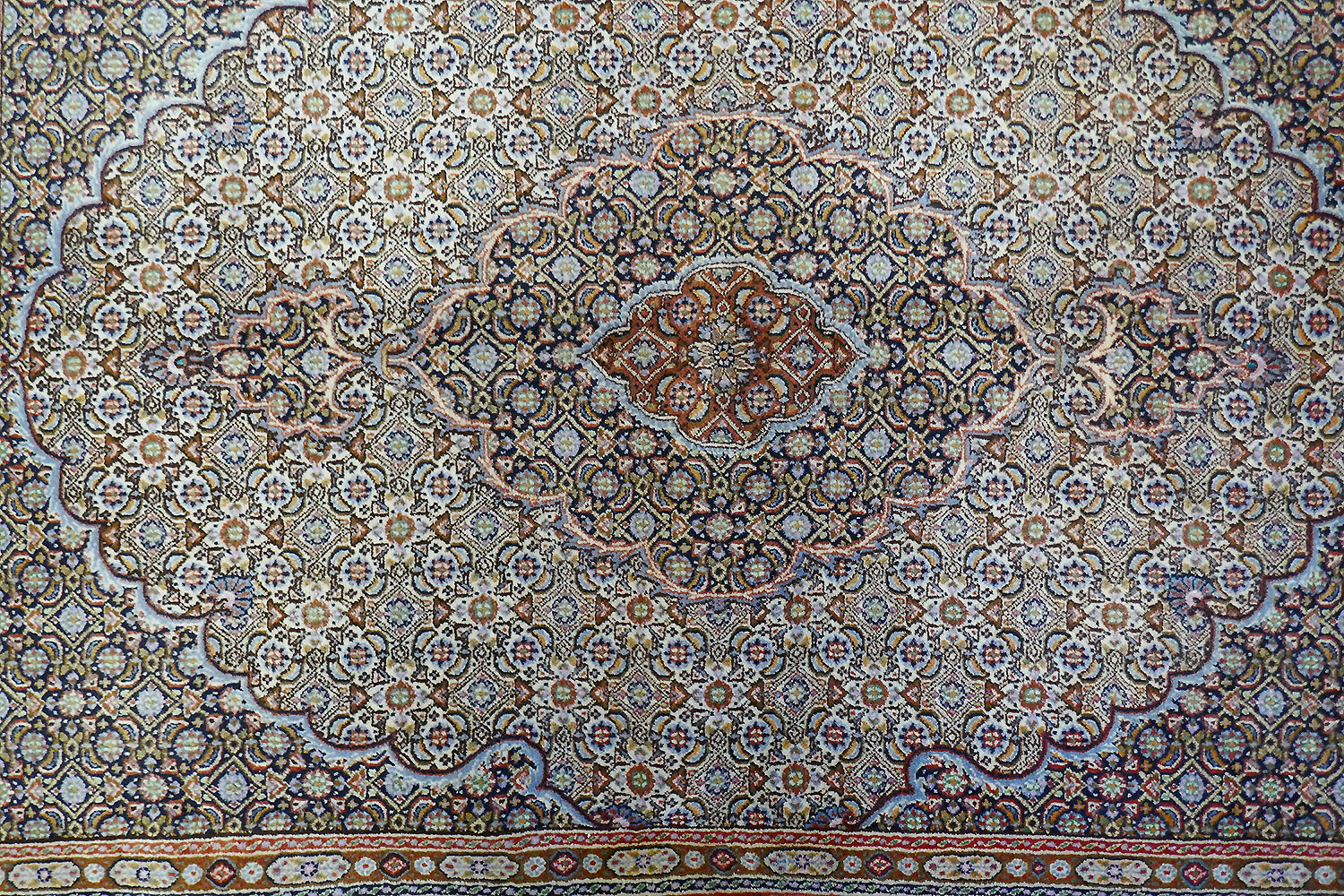 Dimensions : 209 x 147 cm -laine et soie- Pays Iran - Épaisseur : mm - Densité de nouage : Nœuds au m² - Surface : 0 m² - Poids : 0 Kgs - Age : - Confection : - Forme : - Type :