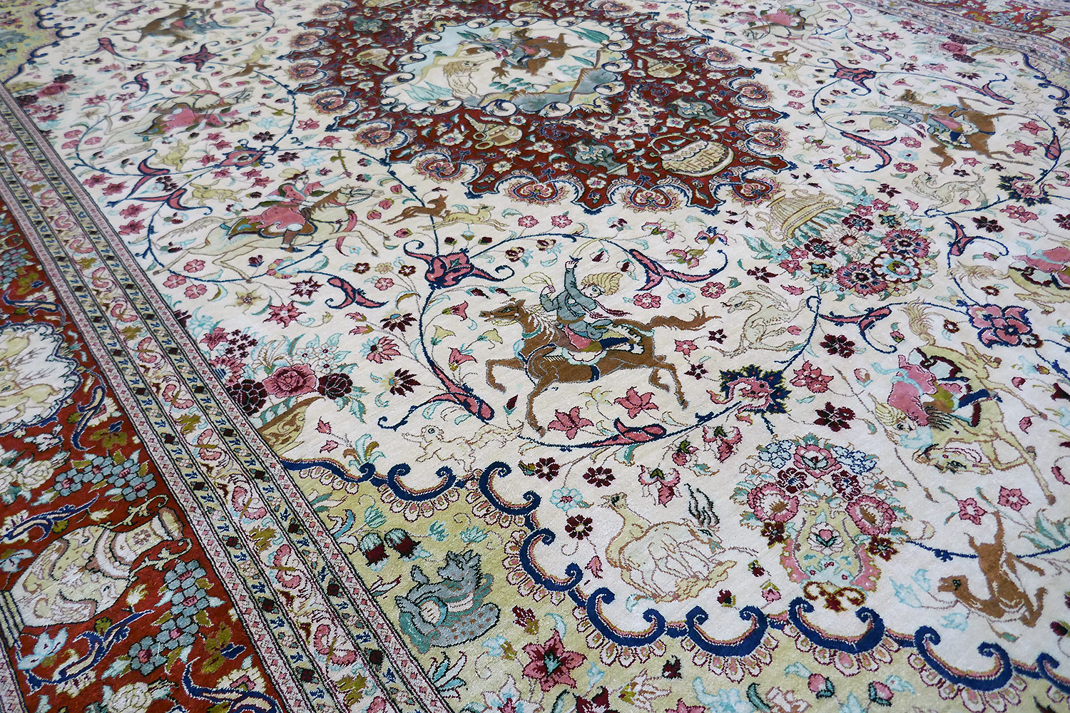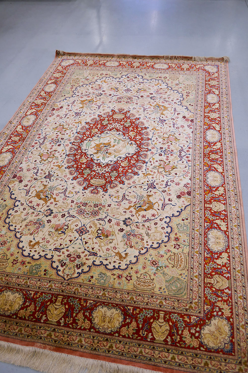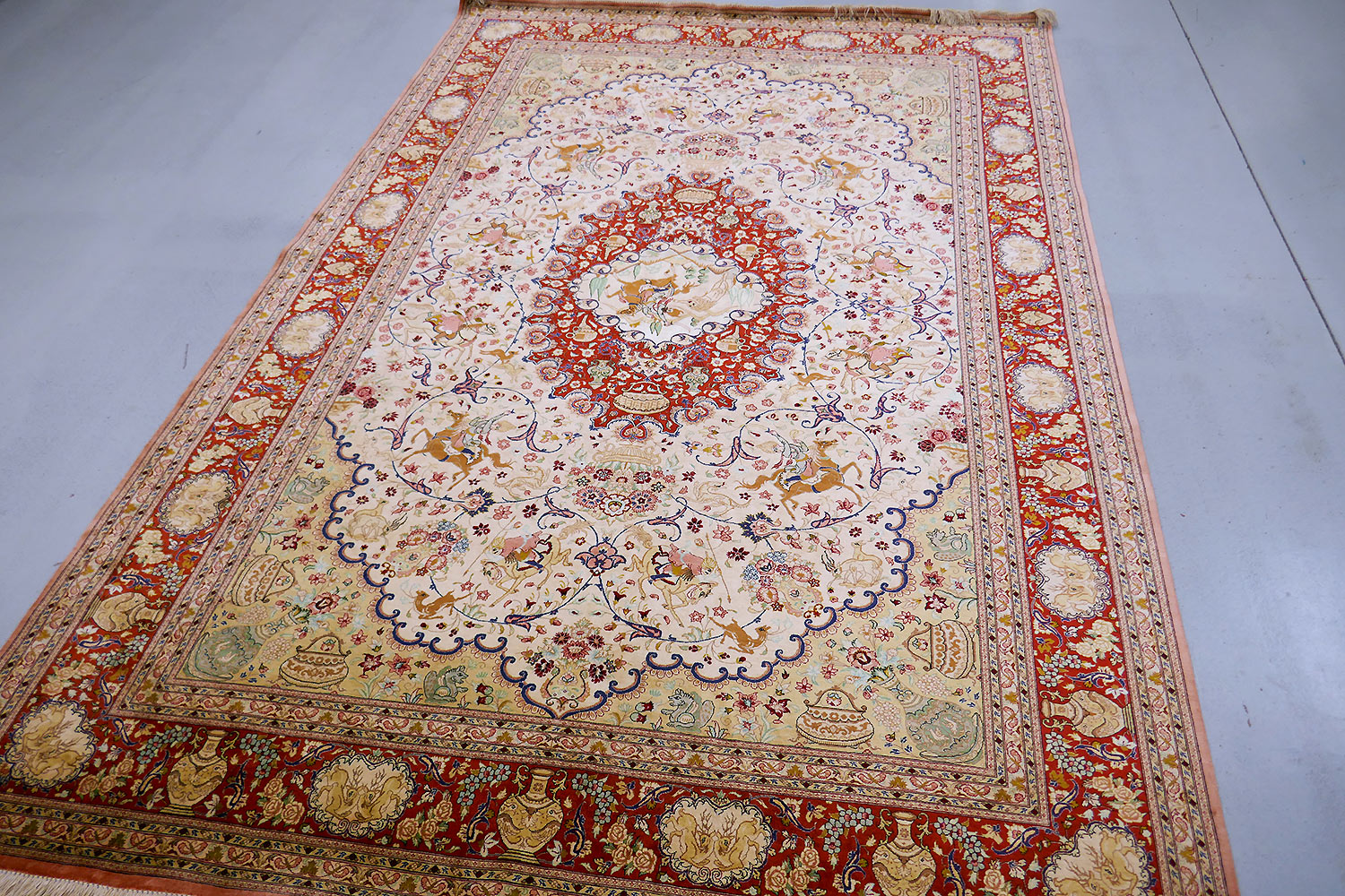 Dimensions : 293 x 198 cm -soie- Pays Iran - Épaisseur : 3 mm - Densité de nouage : 1.000.000 Nœuds au m² - Surface : 5.8 m² - Poids : 11.6 Kgs - Age : contemporain - Confection : Noué main - Forme : Tapis de salon - Type : Tapis persan