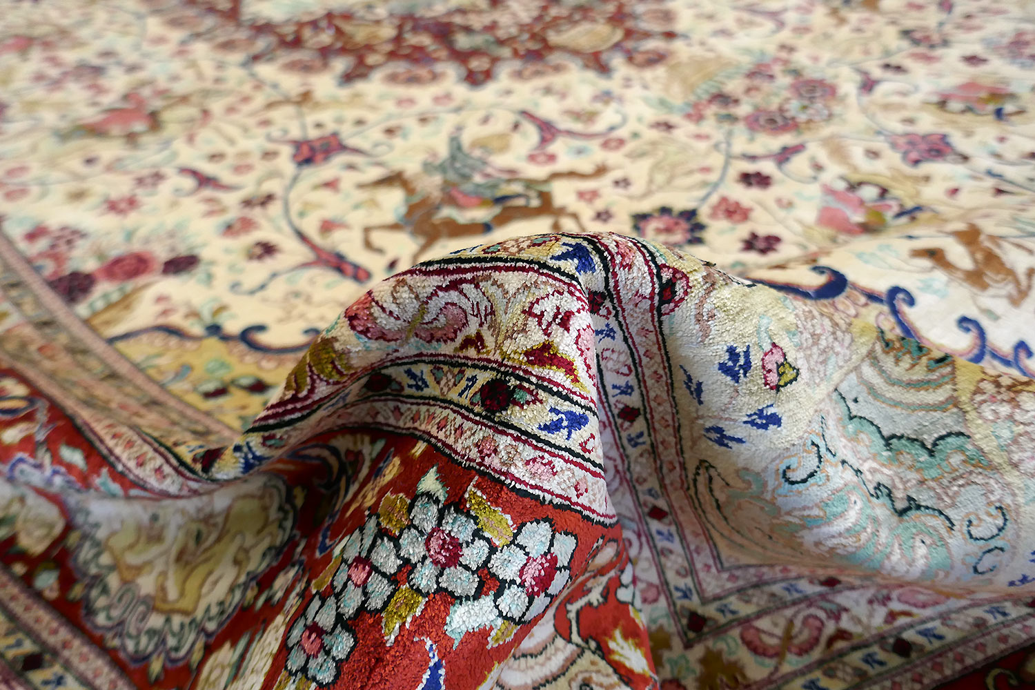 Dimensions : 293 x 194 cm -soie- Pays Iran - Épaisseur : 3 mm - Densité de nouage : 1.000.000 Nœuds au m² - Surface : 5.68 m² - Poids : 11.37 Kgs - Age : contemporain - Confection : Noué main - Forme : Tapis de salon - Type : Tapis persan