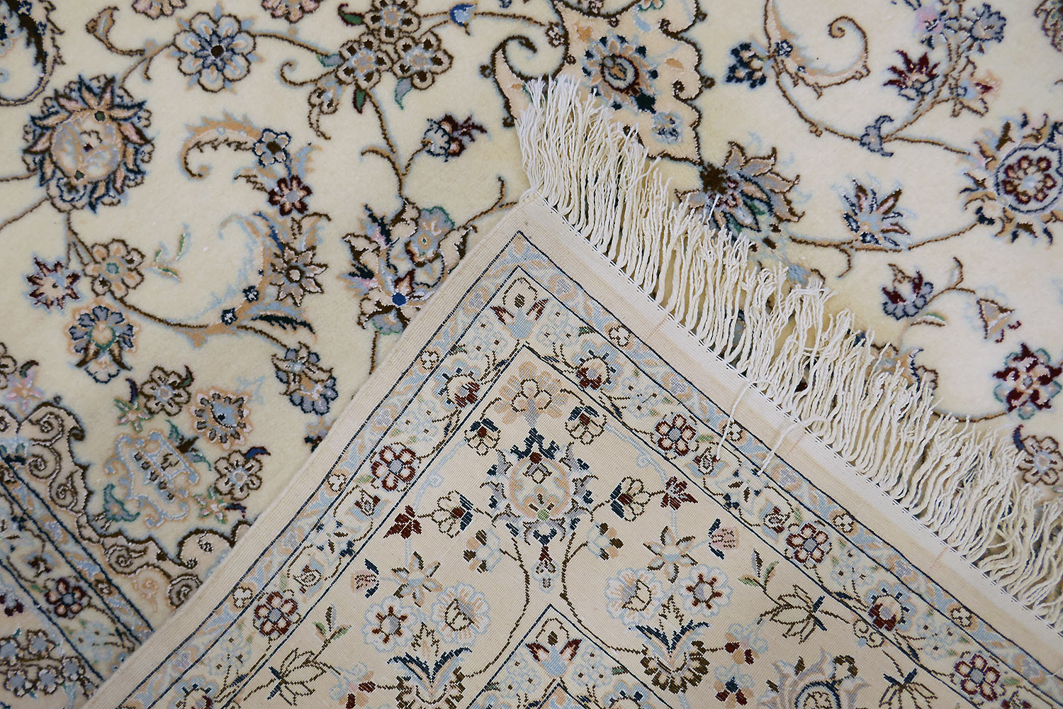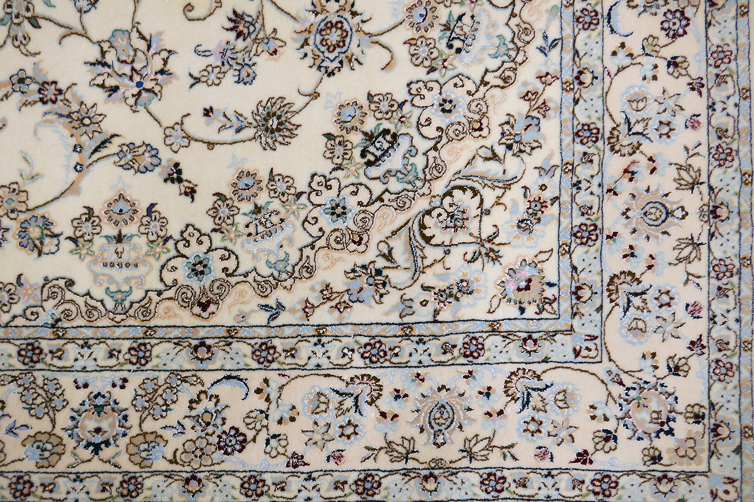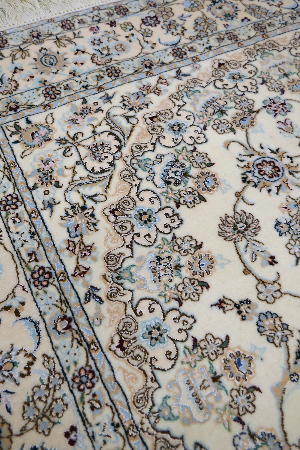 Dimensions : 245 x 164 cm -laine et soie- Pays Iran - Épaisseur : 8 mm - Densité de nouage : 800.000 Nœuds au m² - Surface : 4.02 m² - Poids : 10.05 Kgs - Age : contemporain - Confection : Noué main - Forme : Tapis de chambre - Type : Tapis persan