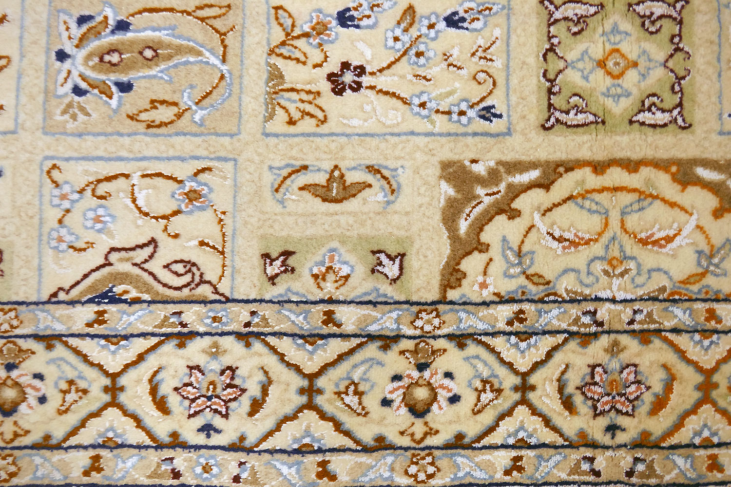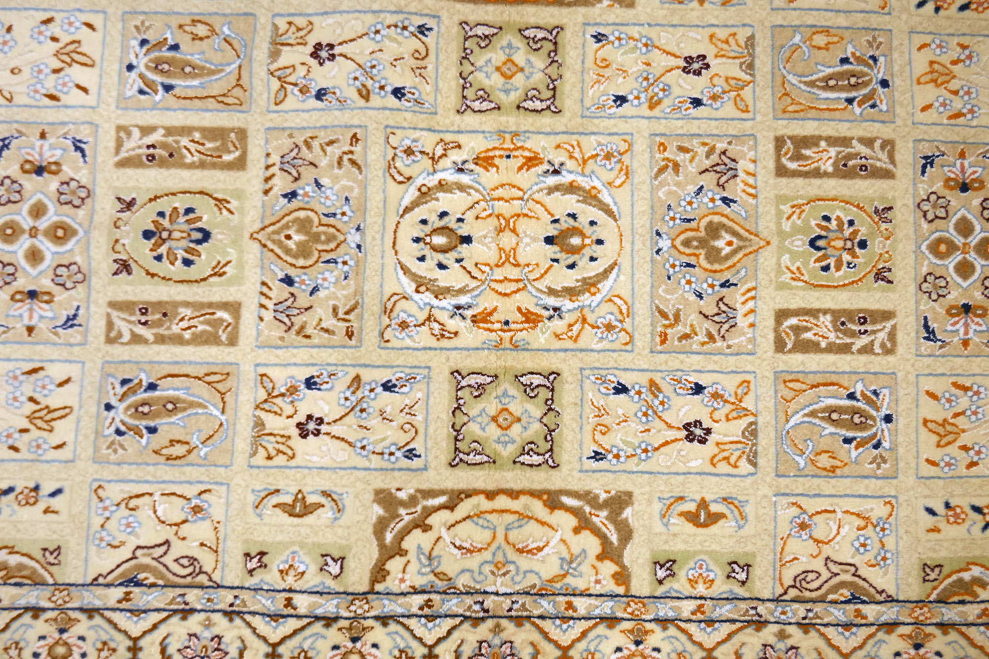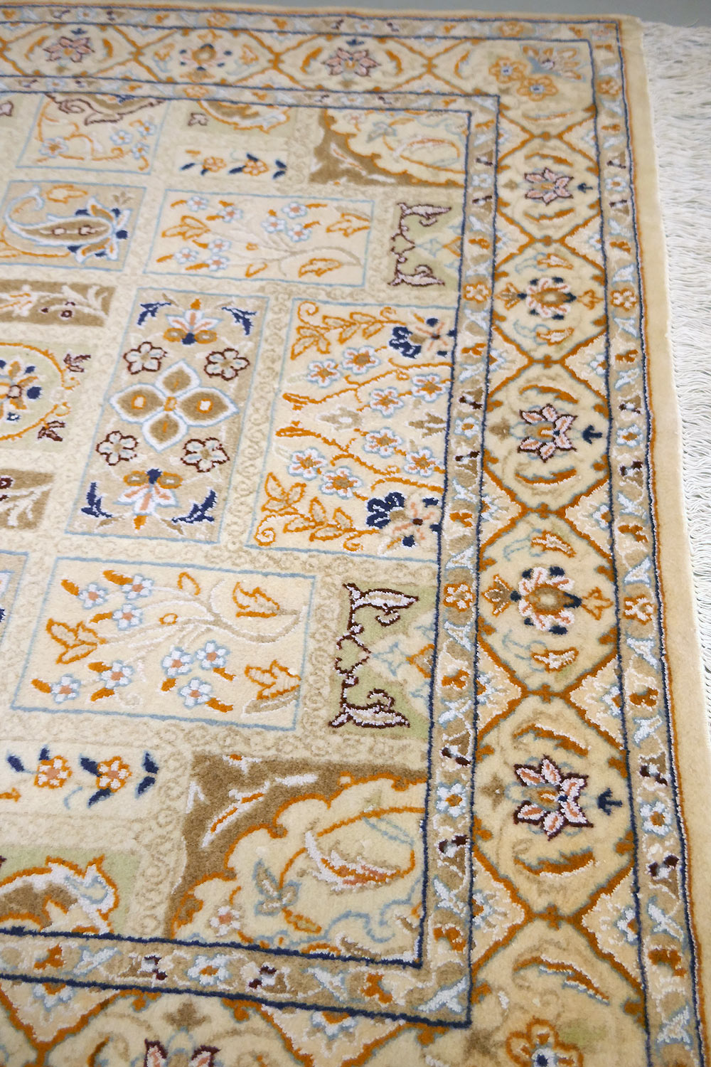 Dimensions : 210 x 130 cm -laine et soie- Pays Iran - Épaisseur : 9 mm - Densité de nouage : 360.000 Nœuds au m² - Surface : 2.73 m² - Poids : 6.83 Kgs - Age : contemporain - Confection : Noué main - Forme : Tapis de chambre - Type : Tapis persan