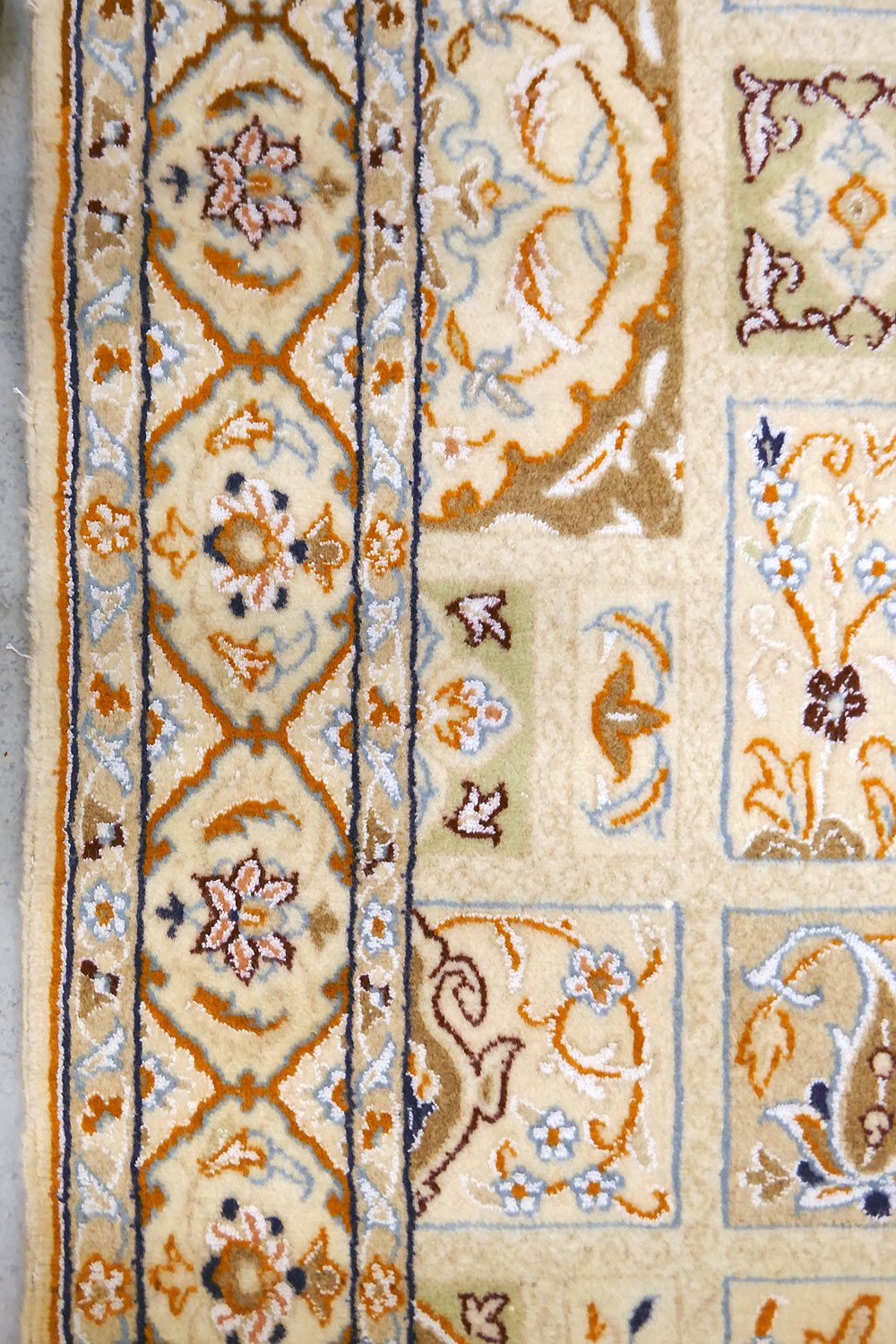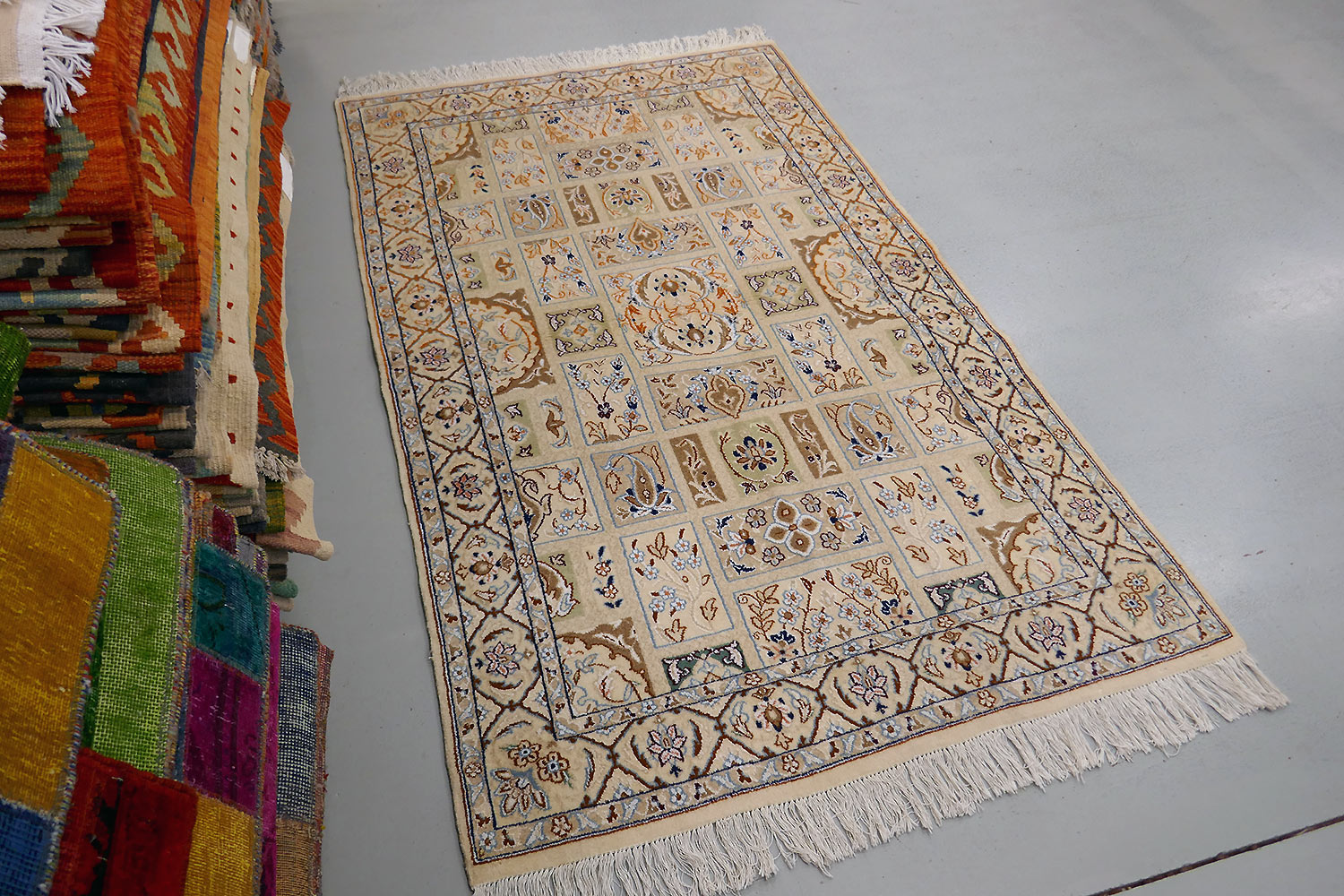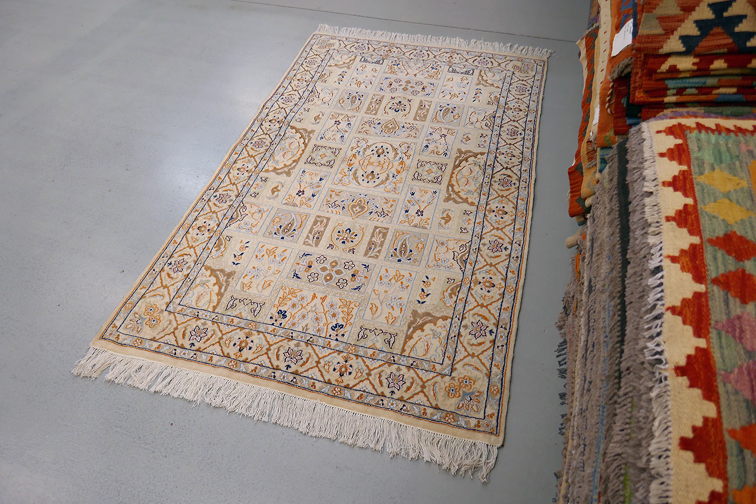 Dimensions : 210 x 130 cm -laine et soie- Pays Iran - Épaisseur : 9 mm - Densité de nouage : 360.000 Nœuds au m² - Surface : 2.73 m² - Poids : 6.83 Kgs - Age : contemporain - Confection : Noué main - Forme : Tapis de chambre - Type : Tapis persan