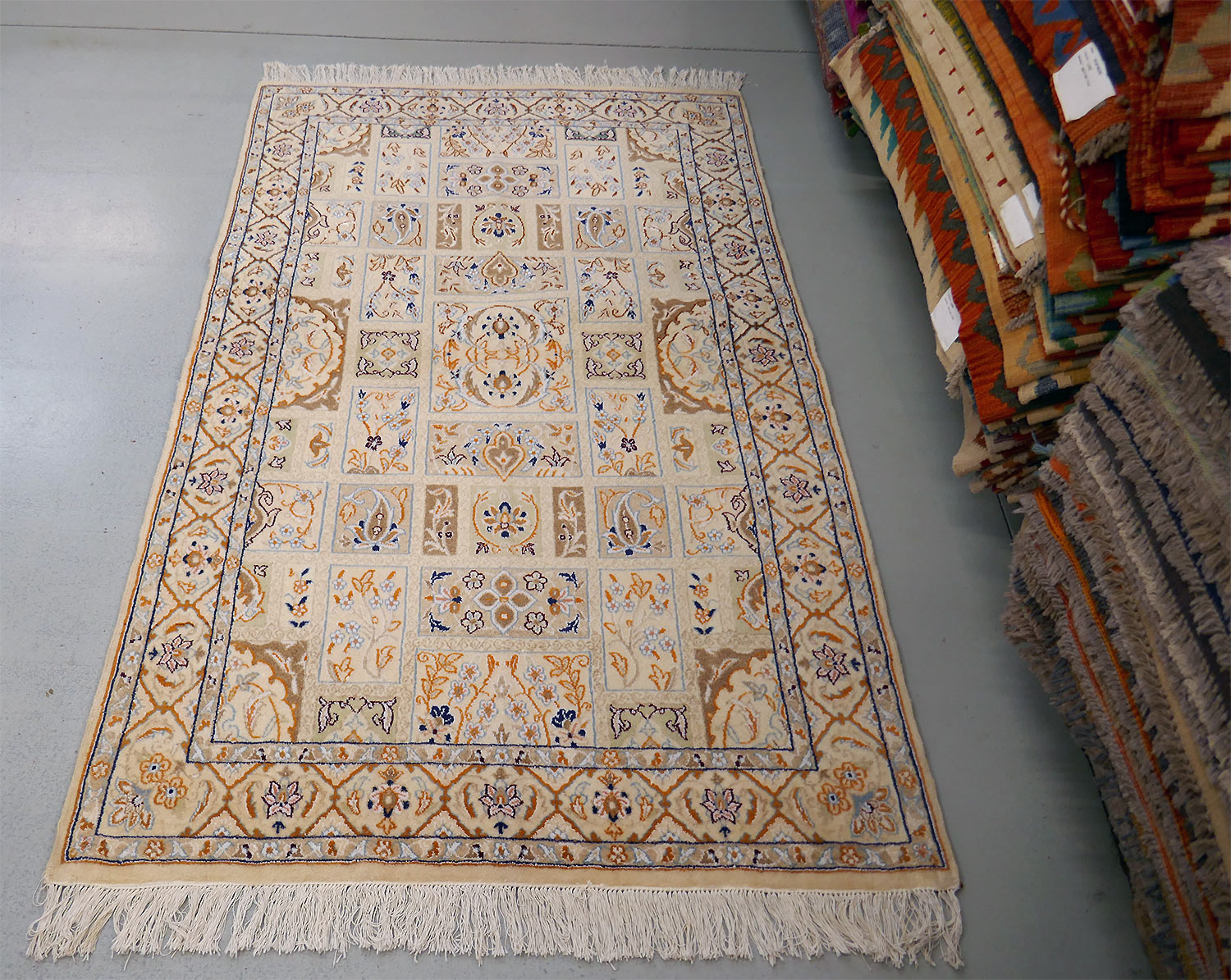 Dimensions : 200 x 125 cm -laine et soie- Pays Iran - Épaisseur : 9 mm - Densité de nouage : 360.000 Nœuds au m² - Surface : 2.5 m² - Poids : 6.25 Kgs - Age : contemporain - Confection : Noué main - Forme : Tapis de chambre - Type : Tapis persan
