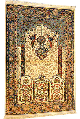 Dimensions : 181 x 124 cm -laine et soie- Pays Pakistan - Référence : T1494 - Épaisseur : 7 mm - Densité de nouage : 200.000 Nœuds au m² - Surface : 2.24 m² - Poids : 5.61 Kgs - Age : contemporain - Confection : Noué main - Utilisation : Tapis de chambre - Origine : Tapis Oriental