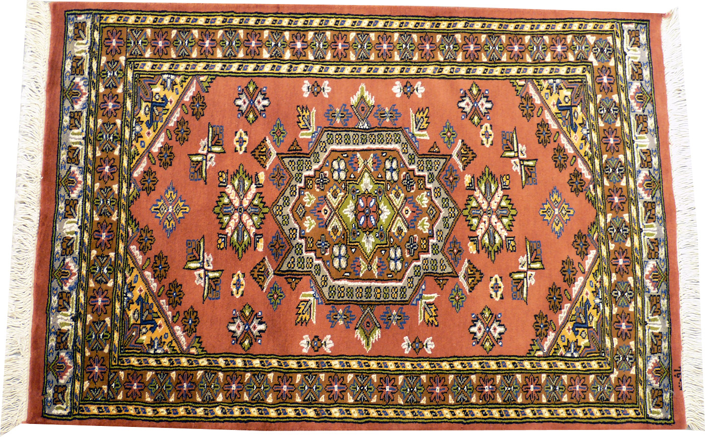 Dimensions : 124 x 82 cm -laine et soie- Pays Pakistan - Épaisseur : 7 mm - Densité de nouage : 250.000 Nœuds au m² - Surface : 1.02 m² - Poids : 2.03 Kgs - Age : contemporain - Confection : Noué main - Forme : Tapis de chambre - Type : Tapis Oriental