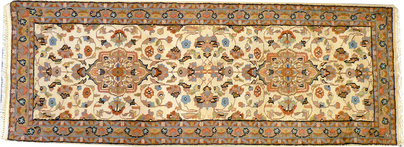 Dimensions : 183 x 62 cm -laine et soie- Pays Pakistan - Épaisseur : 7 mm - Densité de nouage : 200.000 Nœuds au m² - Surface : 1.13 m² - Poids : 2.84 Kgs - Age : contemporain - Confection : Noué main - Forme : Tapis de couloirs - Type : Tapis Oriental