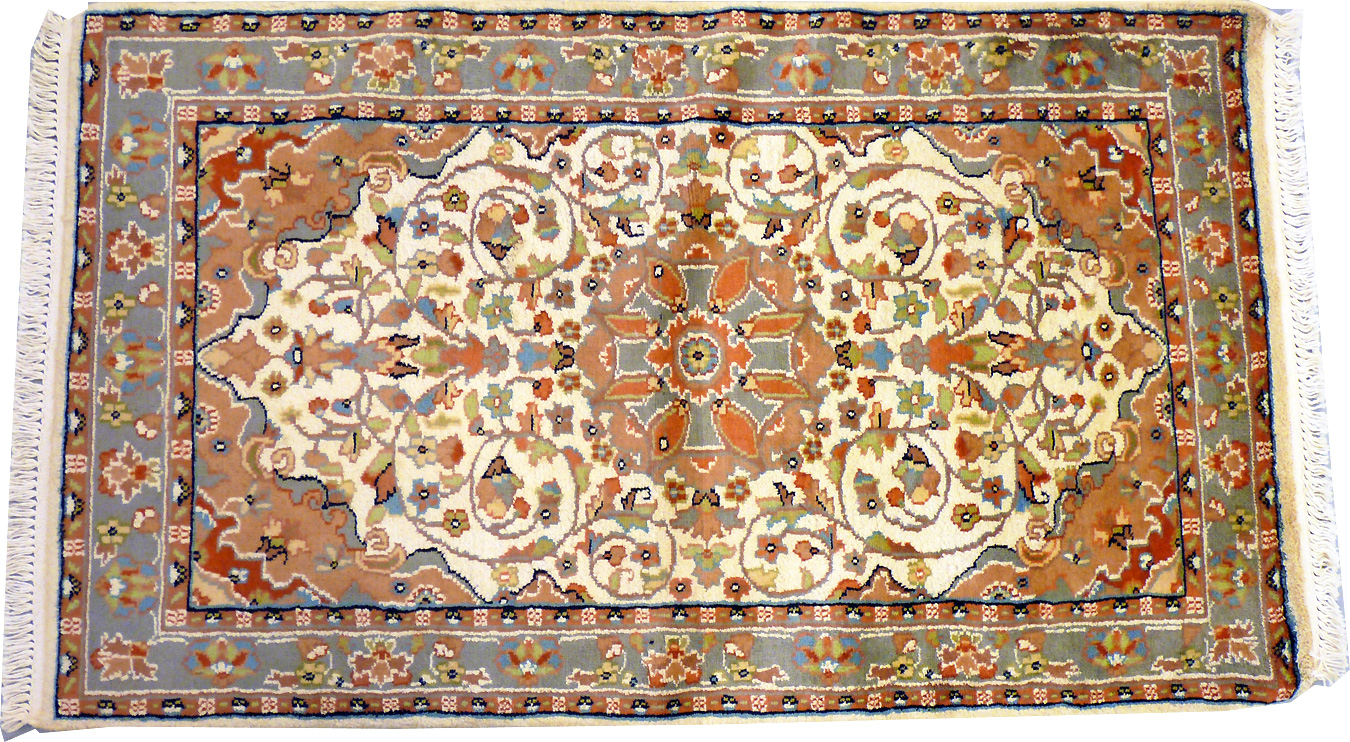 Dimensions : 89 x 63 cm -laine et soie- Pays Pakistan - Épaisseur : 7 mm - Densité de nouage : 200.000 Nœuds au m² - Surface : 0.56 m² - Poids : 1.4 Kgs - Age : contemporain - Confection : Noué main - Forme : Tapis de chambre - Type : Tapis Oriental
