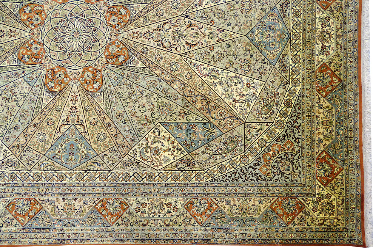 Dimensions : 333 x 247 cm -soie- Pays Inde - Épaisseur : 6 mm - Densité de nouage : 500.000 Nœuds au m² - Surface : 8.23 m² - Poids : 16.45 Kgs - Age : contemporain - Confection : Noué main - Forme : Tapis de salon - Type : Tapis Oriental