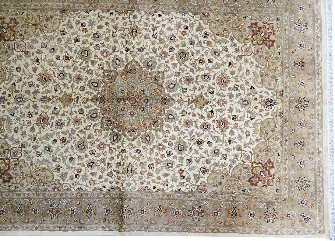 Dimensions : 242 x 171 cm -laine et soie- Pays Inde - Épaisseur : 10 mm - Densité de nouage : 500.000 Nœuds au m² - Surface : 4.14 m² - Poids : 10.35 Kgs - Age : contemporain - Confection : Noué main - Forme : Tapis de chambre - Type : Tapis Oriental