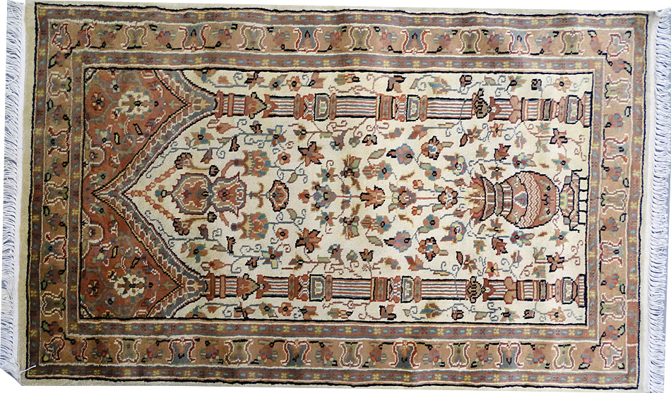 Dimensions : 89 x 63 cm -laine et soie- Pays Pakistan - Épaisseur : 7 mm - Densité de nouage : 200.000 Nœuds au m² - Surface : 0.56 m² - Poids : 1.4 Kgs - Age : contemporain - Confection : Noué main - Forme : Tapis de chambre - Type : Tapis Oriental