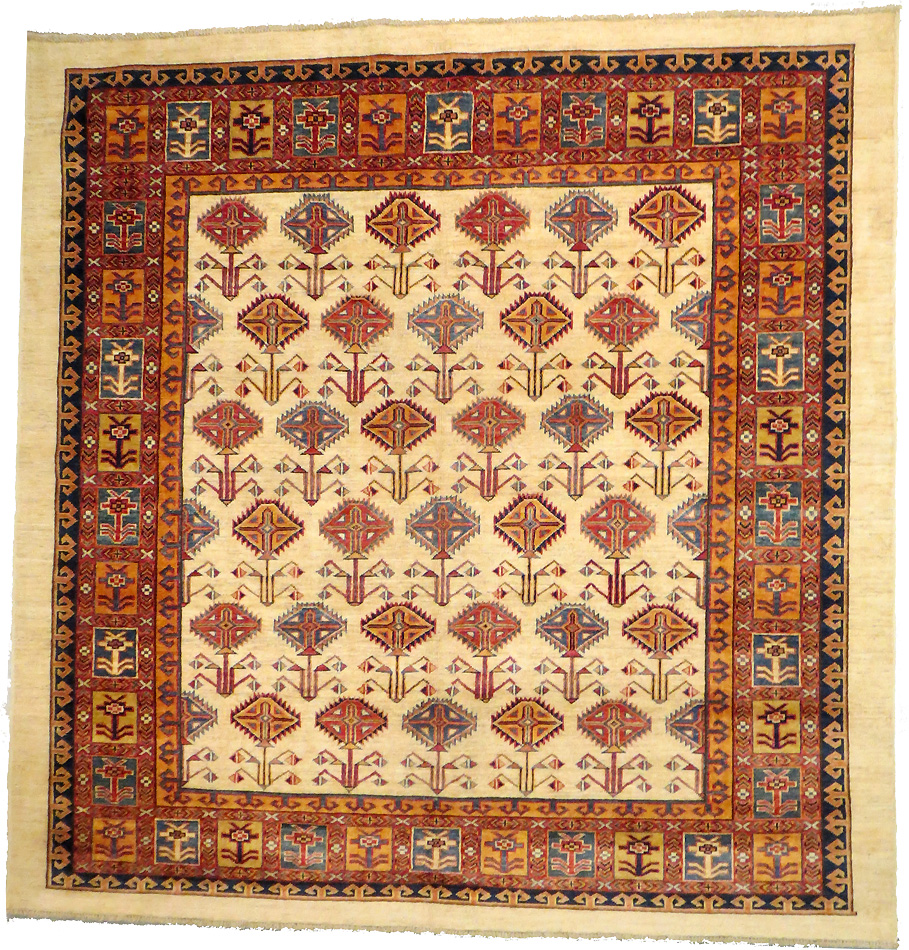Dimensions : 181 x 172 cm -laine- Pays Afghanistan - Épaisseur : 8 mm - Densité de nouage : 300.000 Nœuds au m² - Surface : 3.11 m² - Poids : 9.34 Kgs - Age : contemporain - Confection : Noué main - Forme : Tapis carré - Type : Tapis Oriental