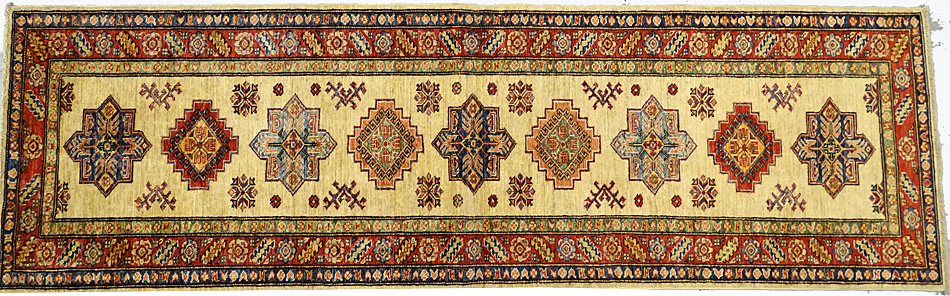 Dimensions : 275 x 80 cm -laine- Pays Afghanistan - Épaisseur : 8 mm - Densité de nouage : 300.000 Nœuds au m² - Surface : 2.2 m² - Poids : 6.6 Kgs - Age : contemporain - Confection : Noué main - Forme : Tapis de couloirs - Type : Tapis Oriental