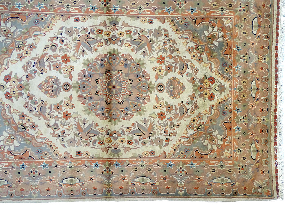 Dimensions : 180 x 124 cm -laine et soie- Pays Pakistan - Épaisseur : 7 mm - Densité de nouage : 200.000 Nœuds au m² - Surface : 2.23 m² - Poids : 5.58 Kgs - Age : contemporain - Confection : Noué main - Forme : Tapis de chambre - Type : Tapis Oriental
