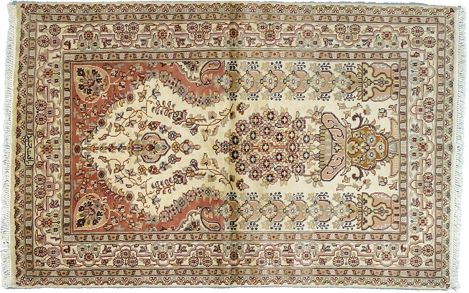 Dimensions : 197 x 130 cm -laine et soie- Pays Pakistan - Épaisseur : 7 mm - Densité de nouage : 200.000 Nœuds au m² - Surface : 2.56 m² - Poids : 6.4 Kgs - Age : contemporain - Confection : Noué main - Forme : Tapis de chambre - Type : Tapis Oriental