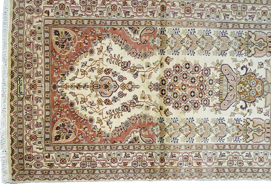 Dimensions : 180 x 124 cm -laine et soie- Pays Pakistan - Épaisseur : 7 mm - Densité de nouage : 200.000 Nœuds au m² - Surface : 2.23 m² - Poids : 5.58 Kgs - Age : contemporain - Confection : Noué main - Forme : Tapis de chambre - Type : Tapis Oriental