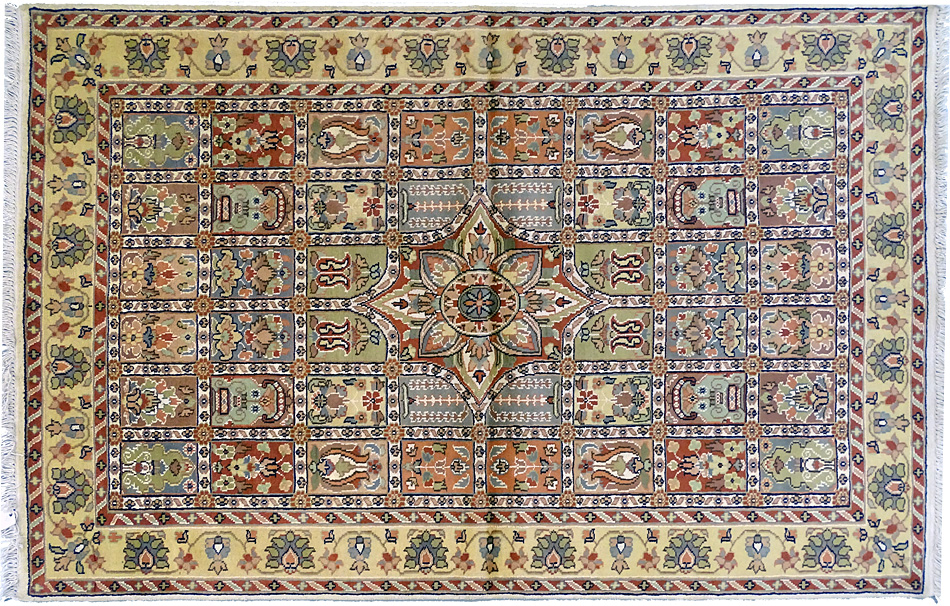 Dimensions : 185 x 124 cm -laine et soie- Pays Pakistan - Épaisseur : 7 mm - Densité de nouage : 200.000 Nœuds au m² - Surface : 2.29 m² - Poids : 5.74 Kgs - Age : contemporain - Confection : Noué main - Forme : Tapis de chambre - Type : Tapis Oriental