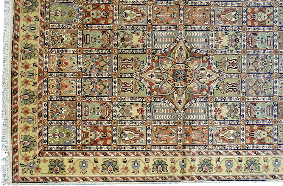Dimensions : 180 x 124 cm -laine et soie- Pays Pakistan - Épaisseur : 7 mm - Densité de nouage : 200.000 Nœuds au m² - Surface : 2.23 m² - Poids : 5.58 Kgs - Age : contemporain - Confection : Noué main - Forme : Tapis de chambre - Type : Tapis Oriental