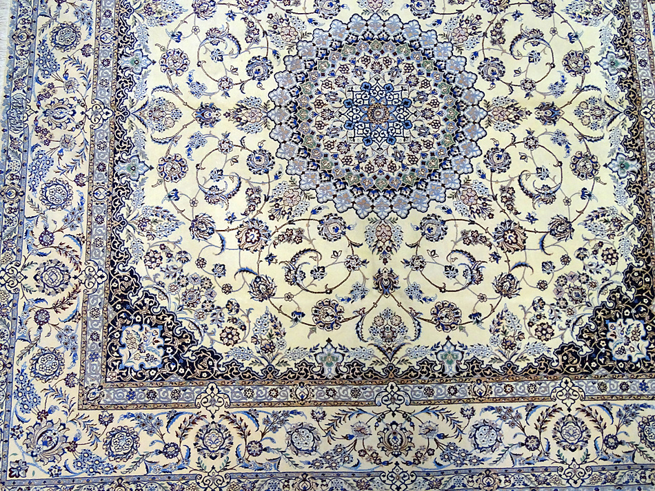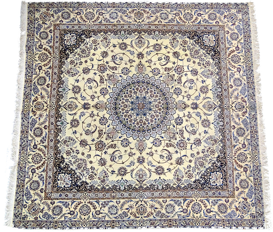 Dimensions : 255 x 250 cm -laine et soie- Pays Iran - Épaisseur : 8 mm - Densité de nouage : 800.000 Nœuds au m² - Surface : 6.38 m² - Poids : 15.94 Kgs - Age : contemporain - Confection : Noué main - Forme : Tapis carré - Type : Tapis persan