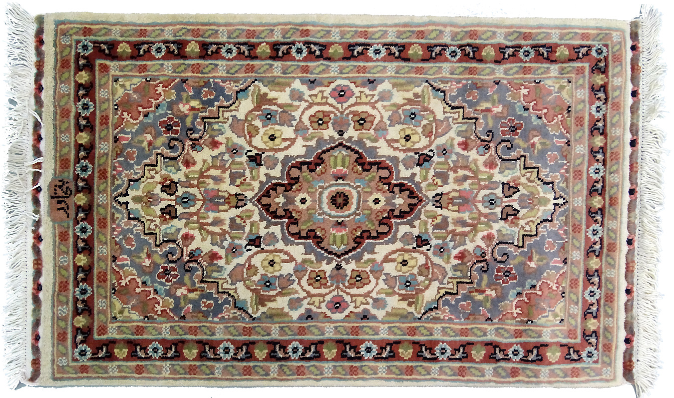 Dimensions : 97 x 61 cm -laine et soie- Pays Pakistan - Épaisseur : 7 mm - Densité de nouage : 200.000 Nœuds au m² - Surface : 0.59 m² - Poids : 1.48 Kgs - Age : contemporain - Confection : Noué main - Forme : Tapis de chambre - Type : Tapis Oriental