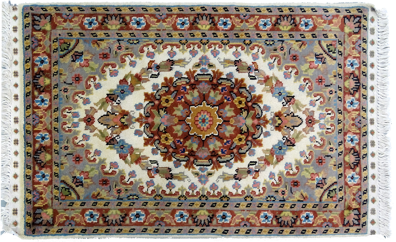 Dimensions : 87 x 62 cm -laine et soie- Pays Pakistan - Épaisseur : 7 mm - Densité de nouage : 200.000 Nœuds au m² - Surface : 0.54 m² - Poids : 1.35 Kgs - Age : contemporain - Confection : Noué main - Forme : Tapis de chambre - Type : Tapis Oriental
