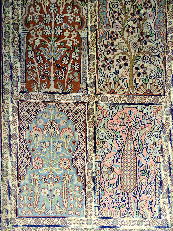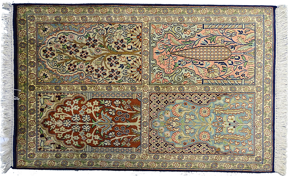 Dimensions : 95 x 67 cm -soie- Pays Inde - Épaisseur : 6 mm - Densité de nouage : 500.000 Nœuds au m² - Surface : 0.64 m² - Poids : 1.27 Kgs - Age : contemporain - Confection : Noué main - Forme : Tapis de chambre - Type : Tapis Oriental