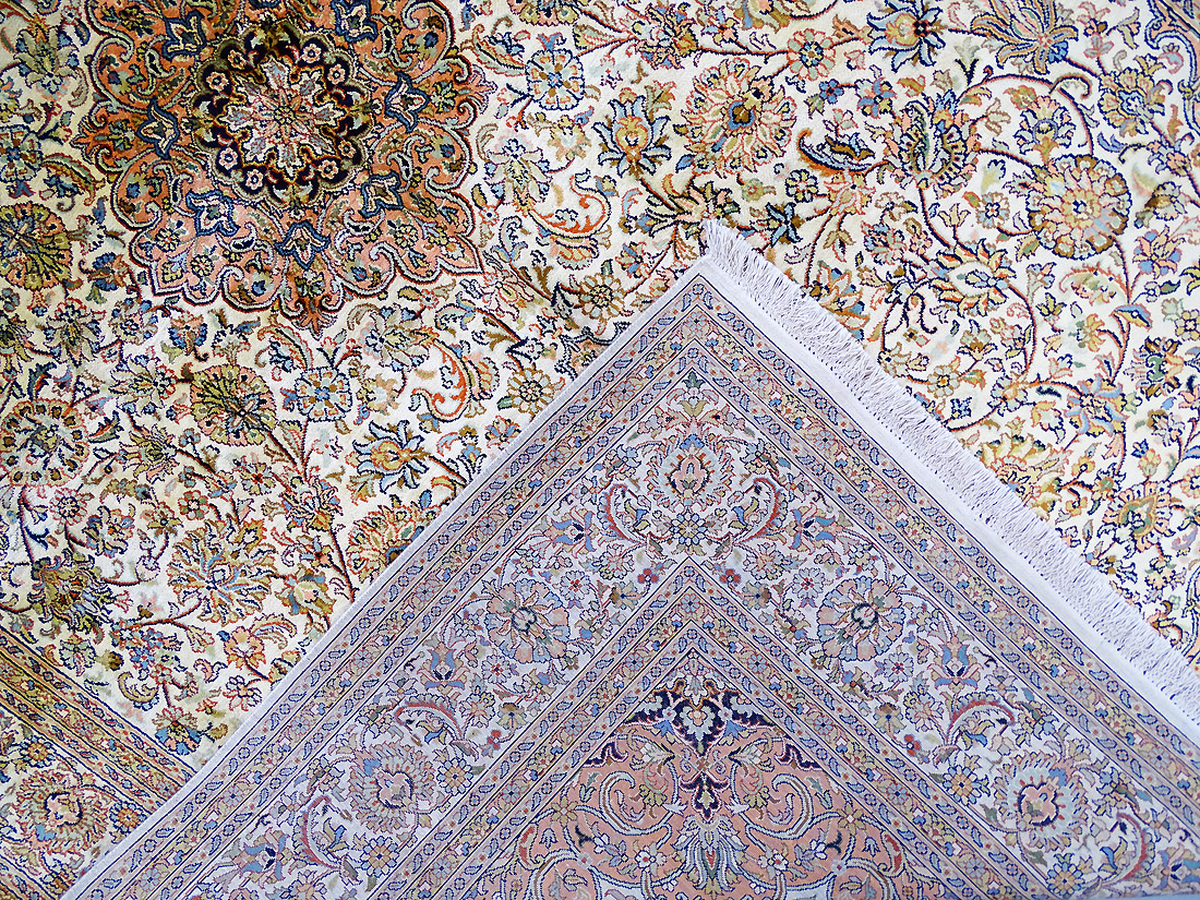Dimensions : 275 x 181 cm -soie- Pays Inde - Épaisseur : 6 mm - Densité de nouage : 500.000 Nœuds au m² - Surface : 4.98 m² - Poids : 9.96 Kgs - Age : contemporain - Confection : Noué main - Forme : Tapis de salon - Type : Tapis Oriental