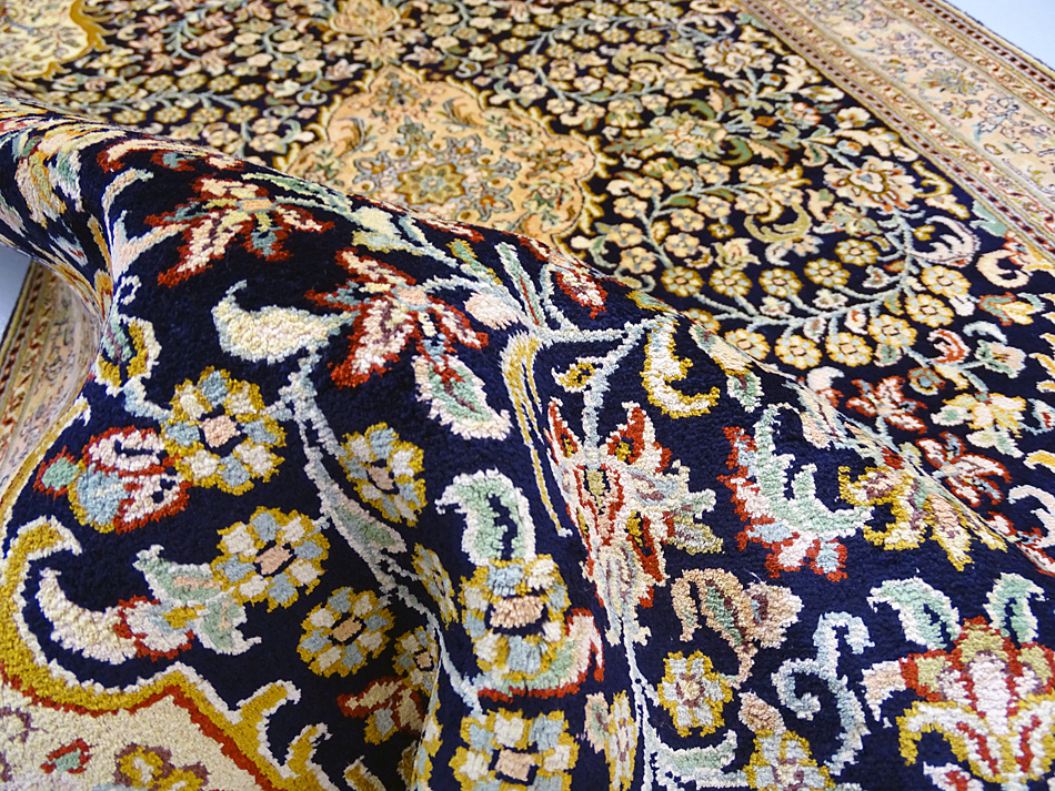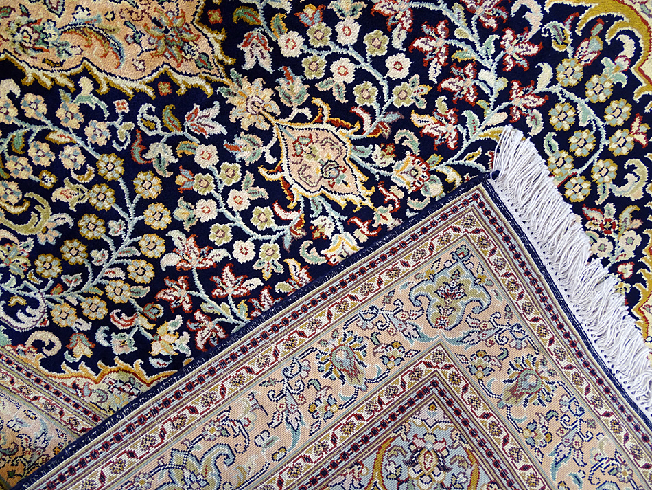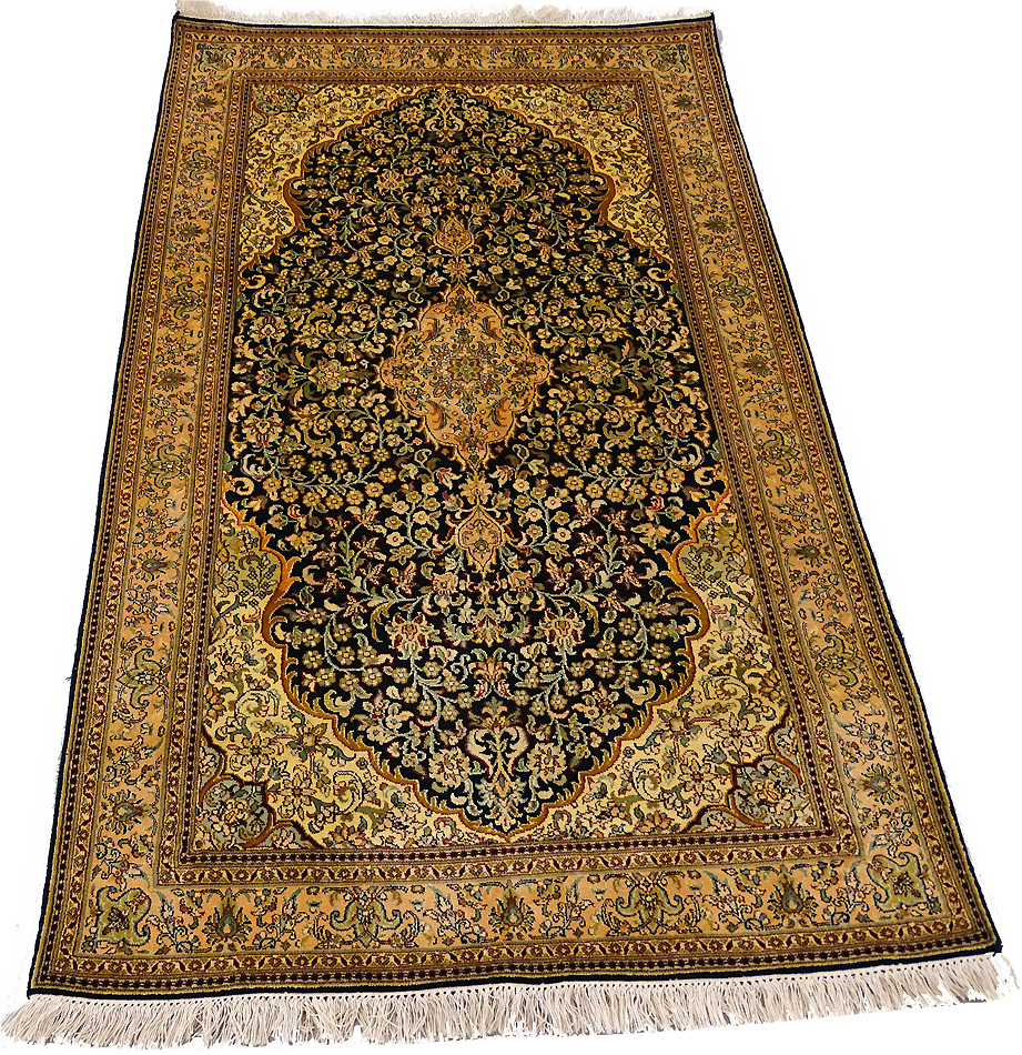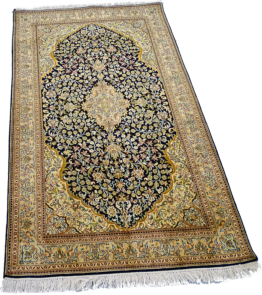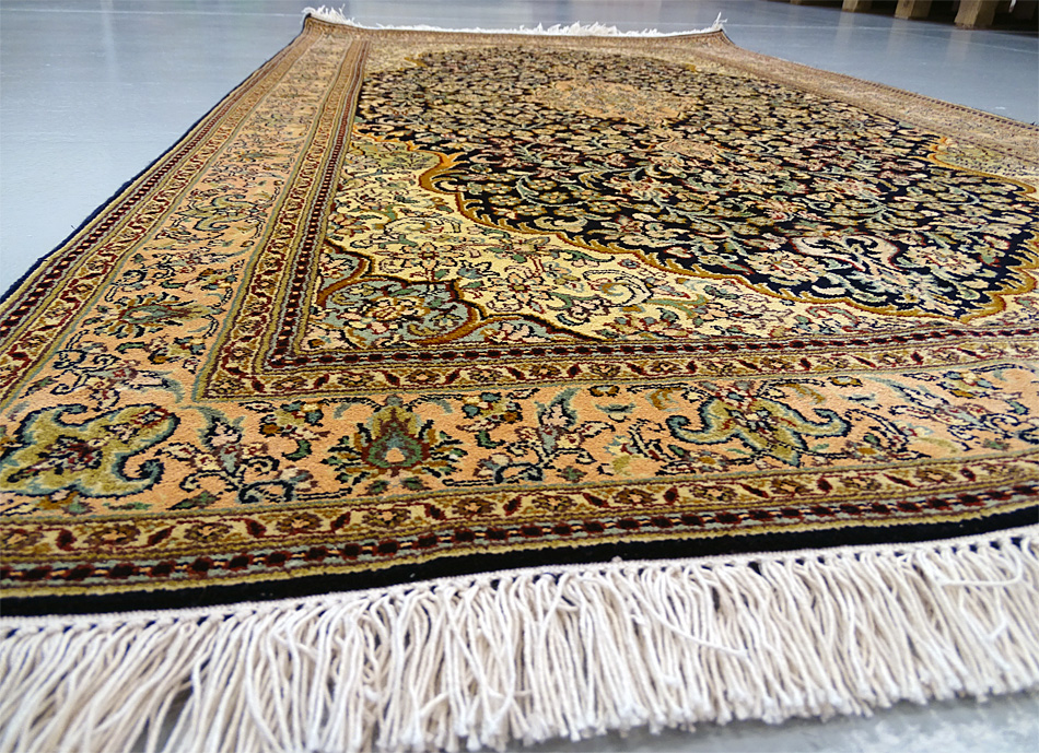 Dimensions : 150 x 100 cm -soie- Pays Inde - Épaisseur : 6 mm - Densité de nouage : 500.000 Nœuds au m² - Surface : 1.5 m² - Poids : 3 Kgs - Age : contemporain - Confection : Noué main - Forme : Tapis de chambre - Type : Tapis Oriental