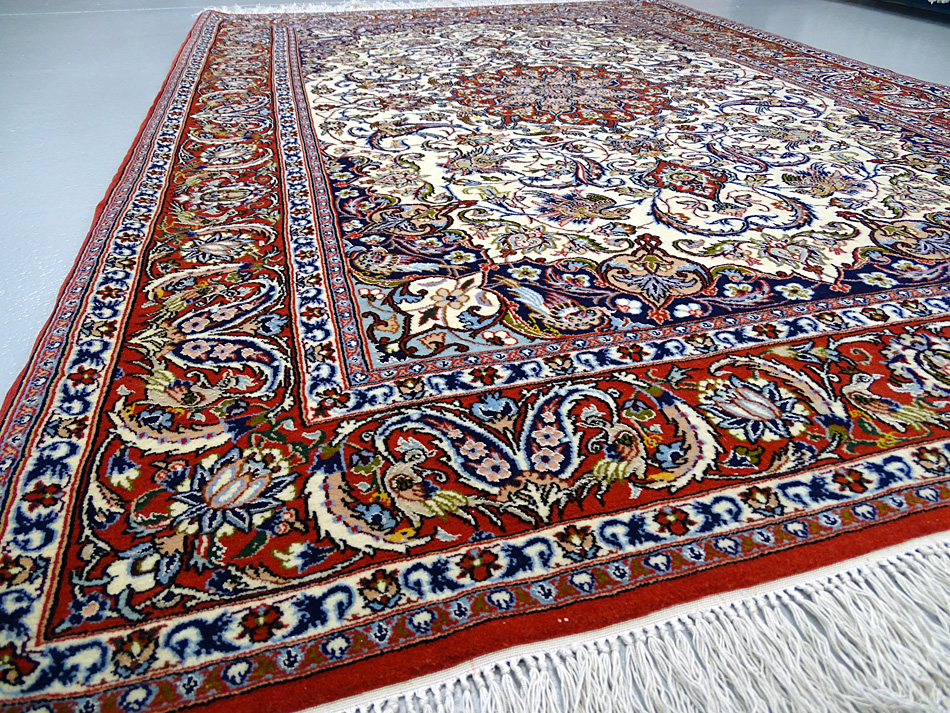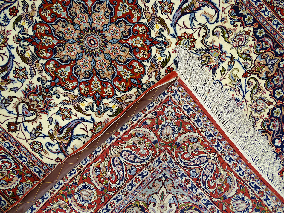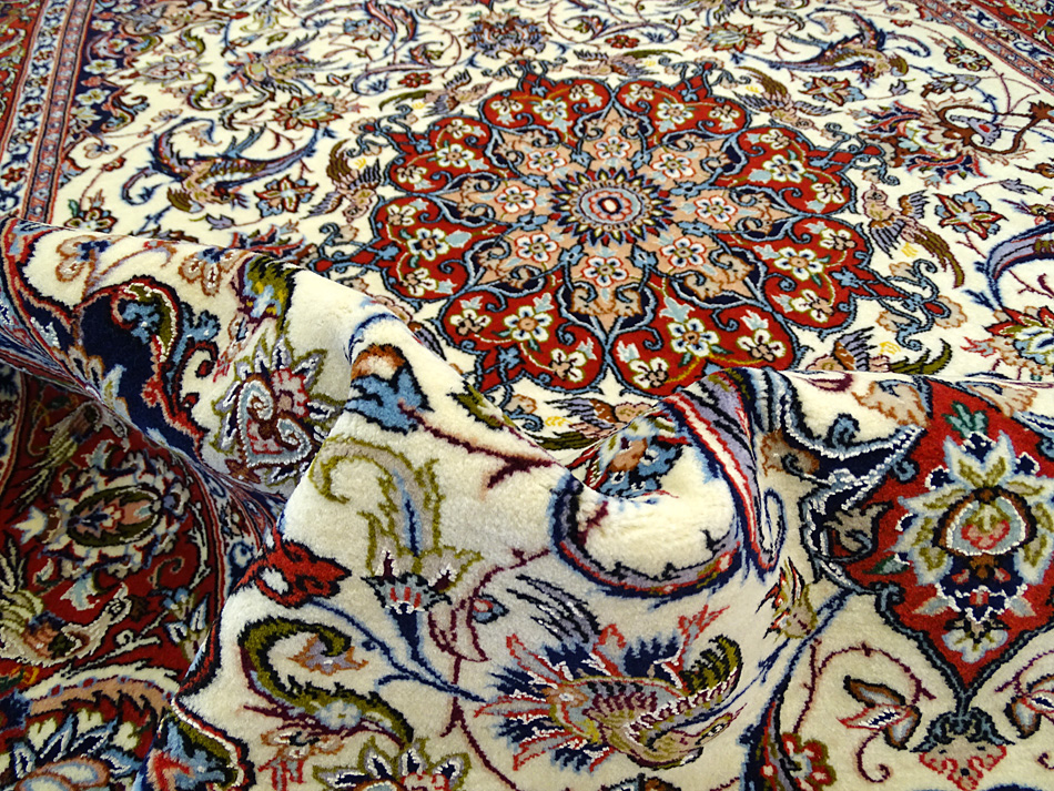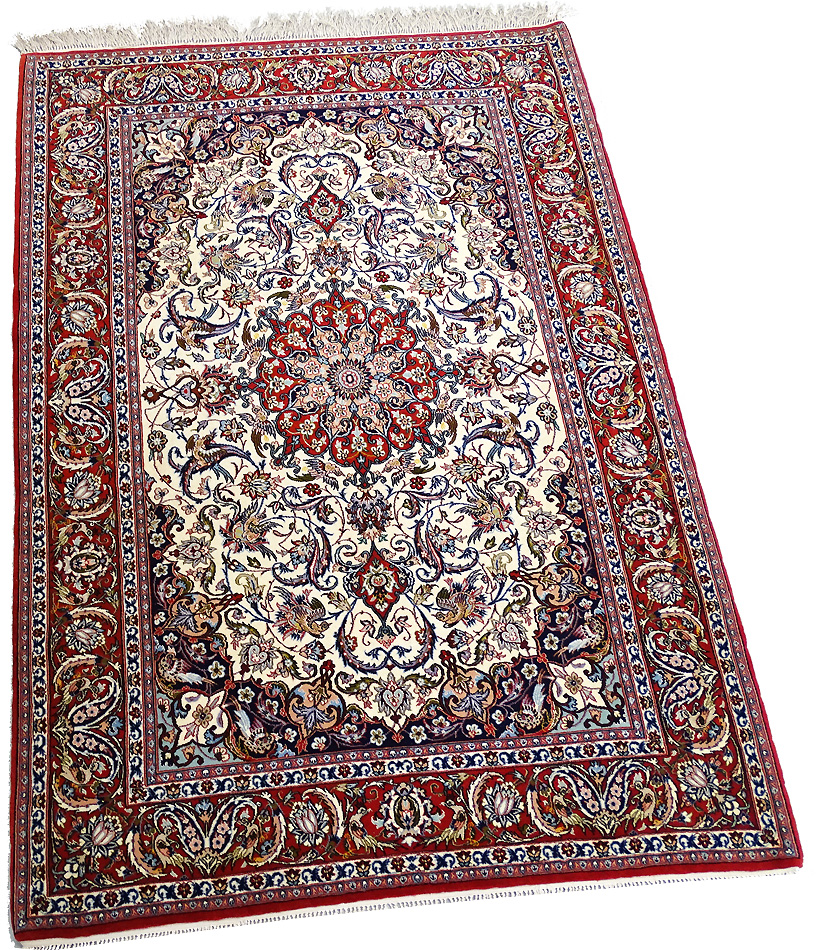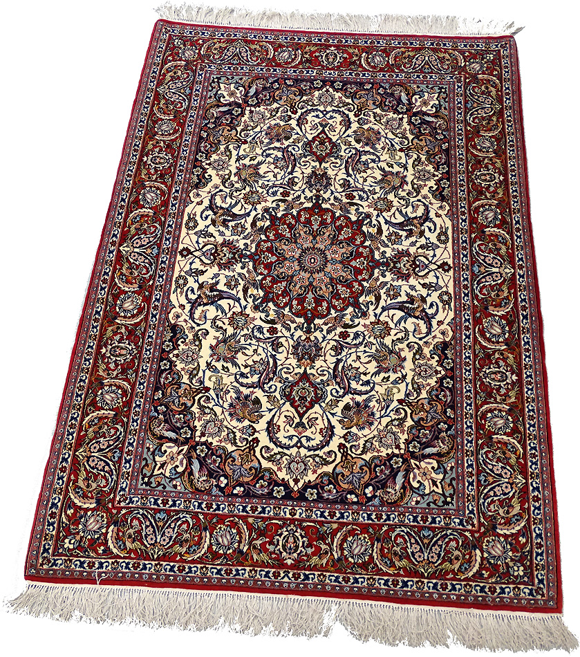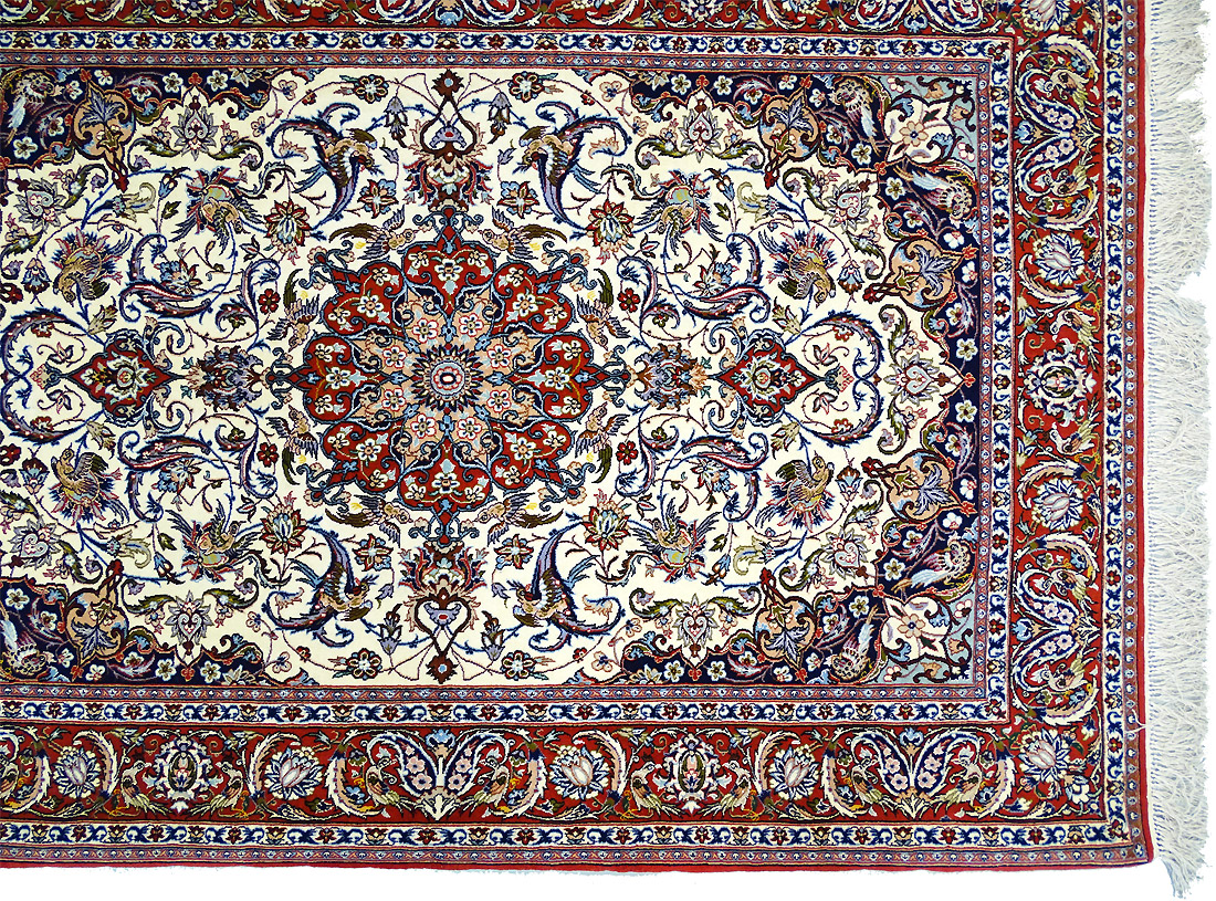 Dimensions : 164 x 115 cm -laine et soie- Pays Iran - Épaisseur : 7 mm - Densité de nouage : 800.000 Nœuds au m² - Surface : 1.89 m² - Poids : 4.72 Kgs - Age : contemporain - Confection : Noué main - Forme : Tapis de chambre - Type : Tapis persan