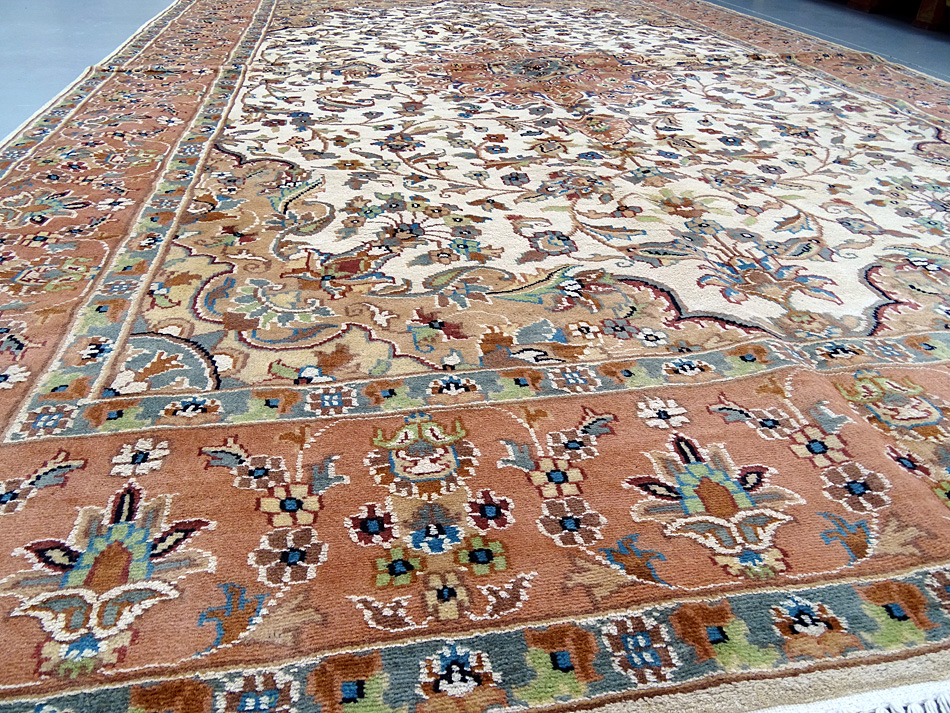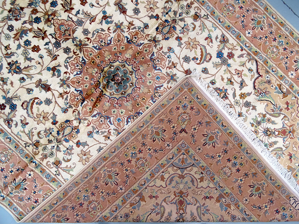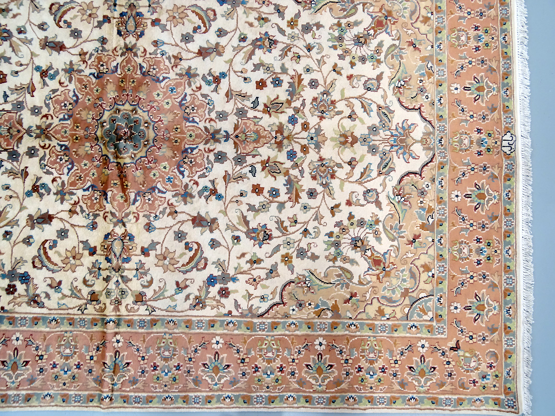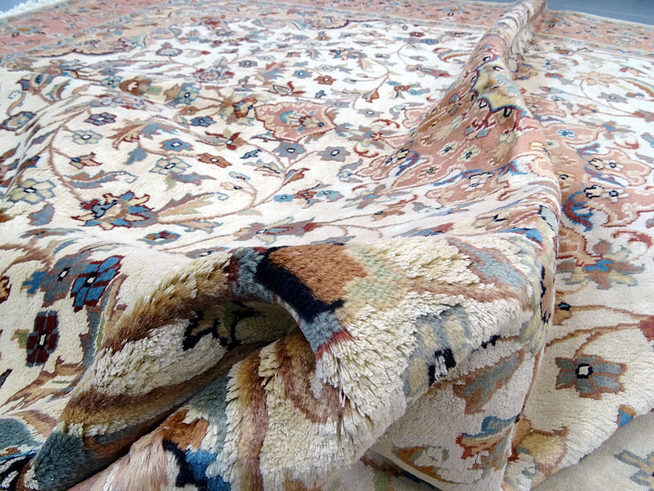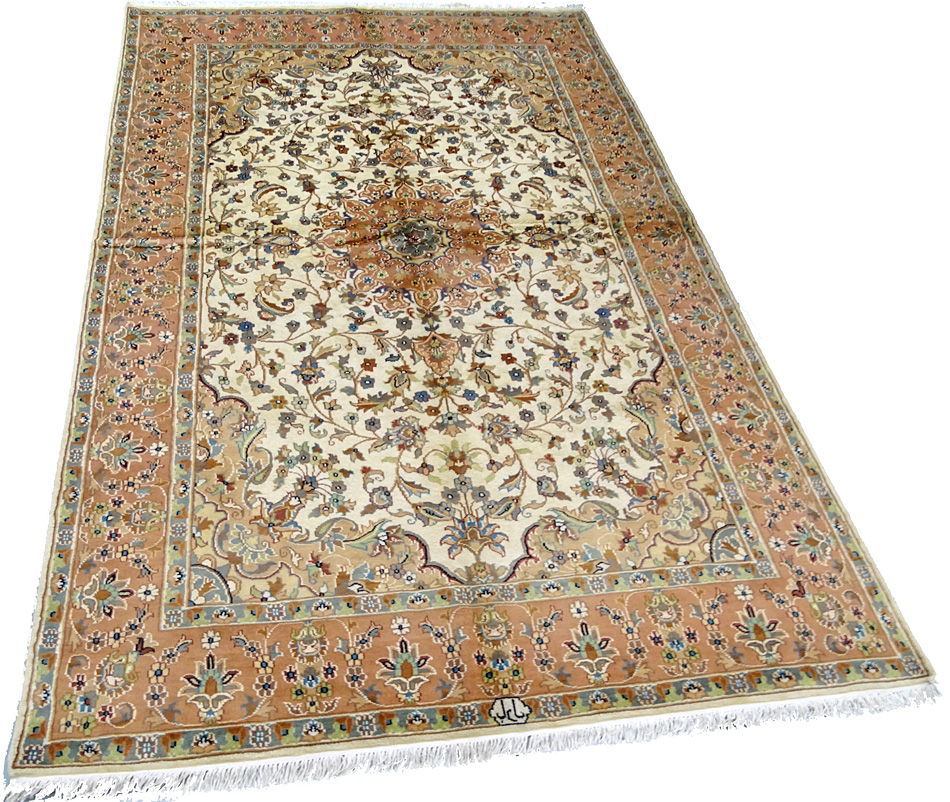 Dimensions : 275 x 187 cm -laine et soie- Pays Pakistan - Épaisseur : 7 mm - Densité de nouage : 200.000 Nœuds au m² - Surface : 5.14 m² - Poids : 12.86 Kgs - Age : contemporain - Confection : Noué main - Forme : Tapis de salon - Type : Tapis Oriental