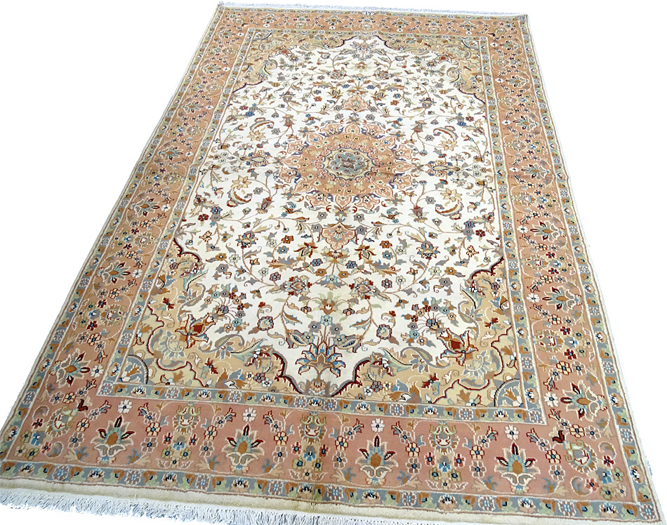 Dimensions : 279 x 188 cm -laine et soie- Pays Pakistan - Épaisseur : 7 mm - Densité de nouage : 200.000 Nœuds au m² - Surface : 5.25 m² - Poids : 13.11 Kgs - Age : contemporain - Confection : Noué main - Forme : Tapis de salon - Type : Tapis Oriental