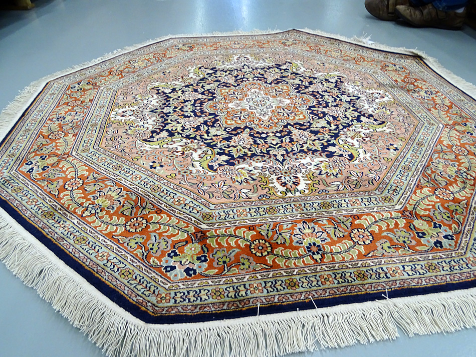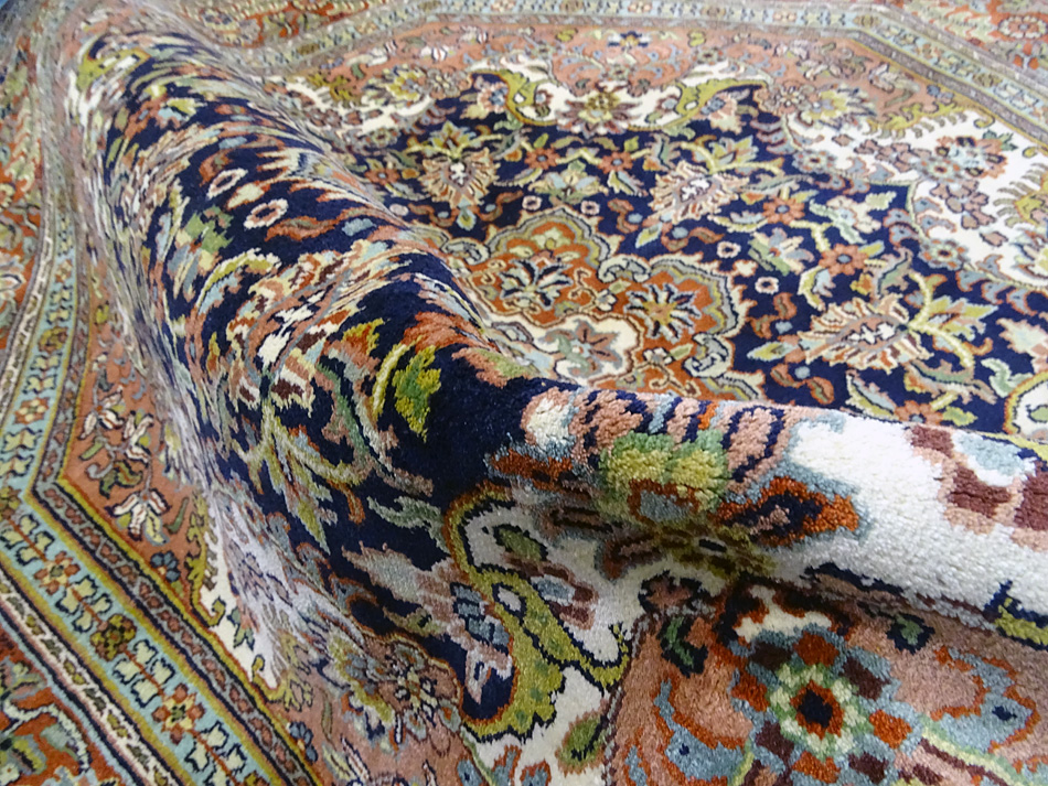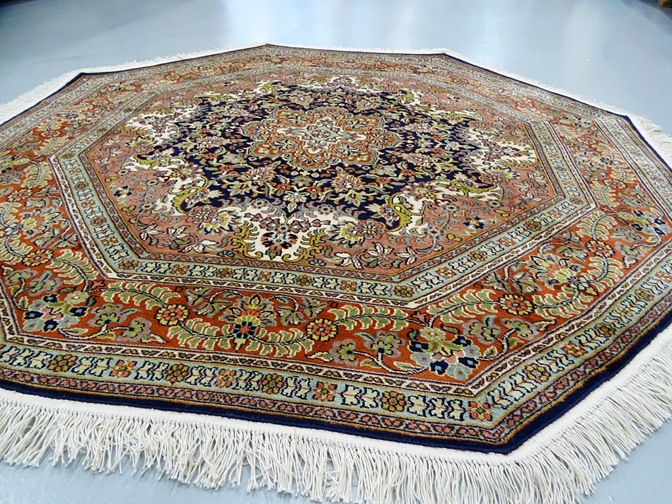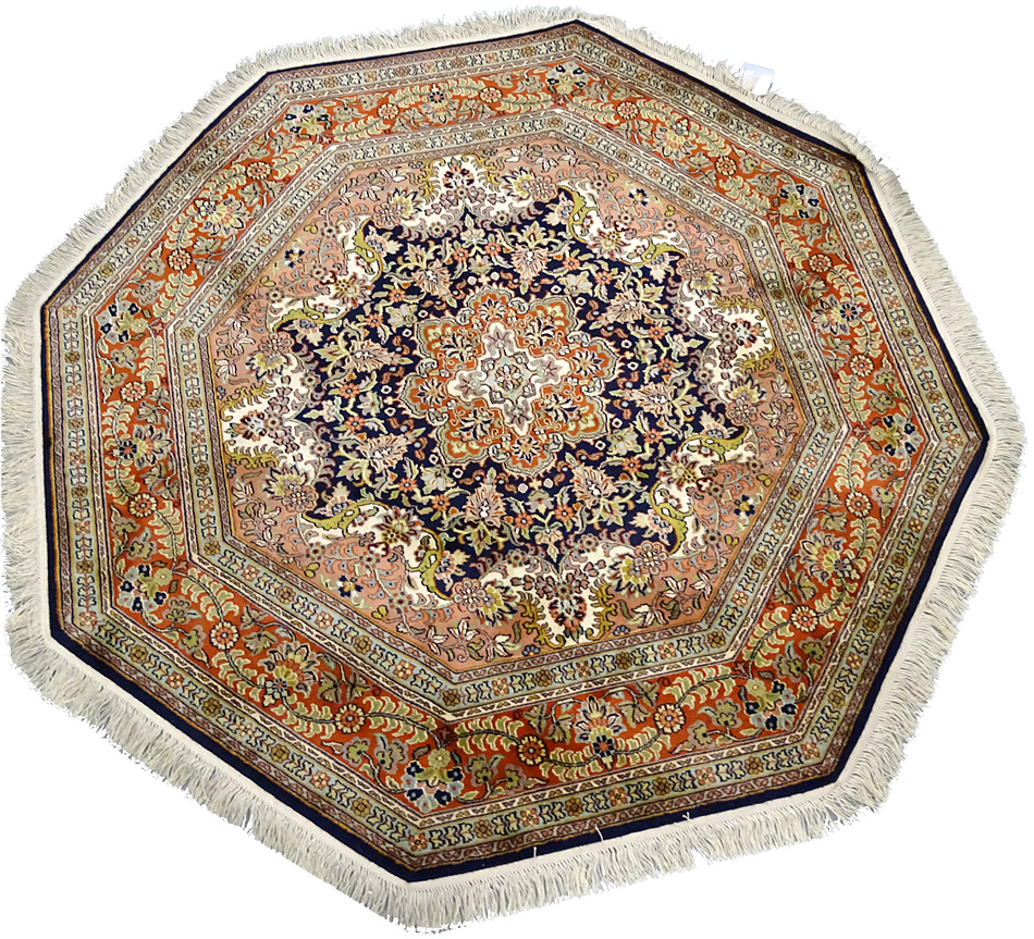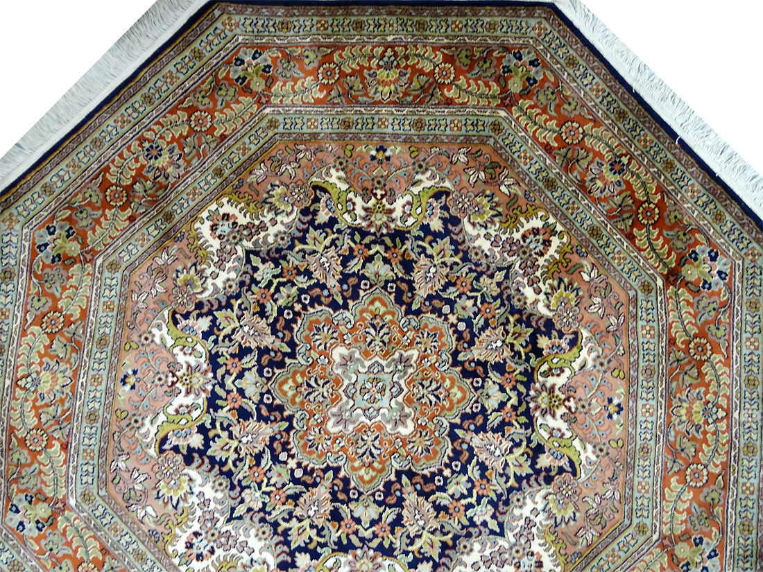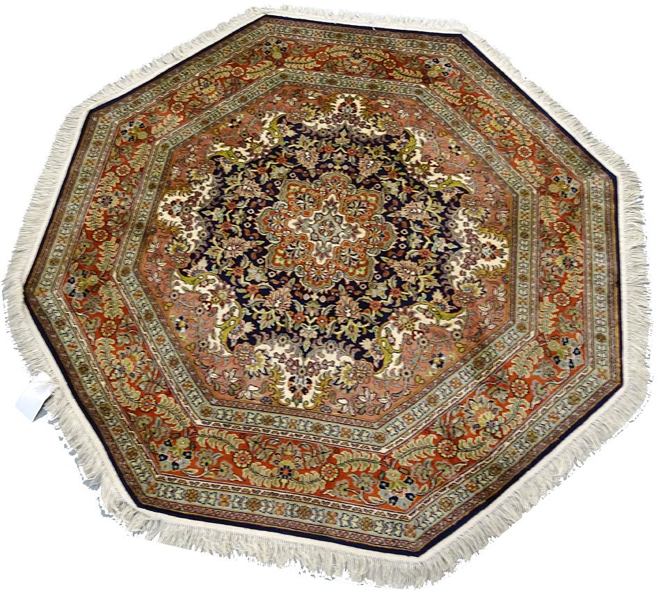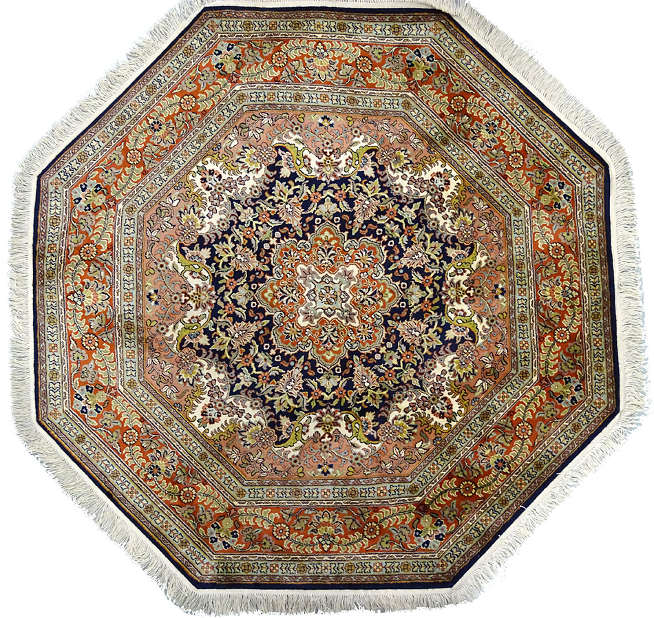 Dimensions : 170 x 167 cm -soie- Pays Inde - Épaisseur : 6 mm - Densité de nouage : 500.000 Nœuds au m² - Surface : 2.84 m² - Poids : 5.68 Kgs - Age : contemporain - Confection : Noué main - Forme : Tapis rond - Type : Tapis Oriental
