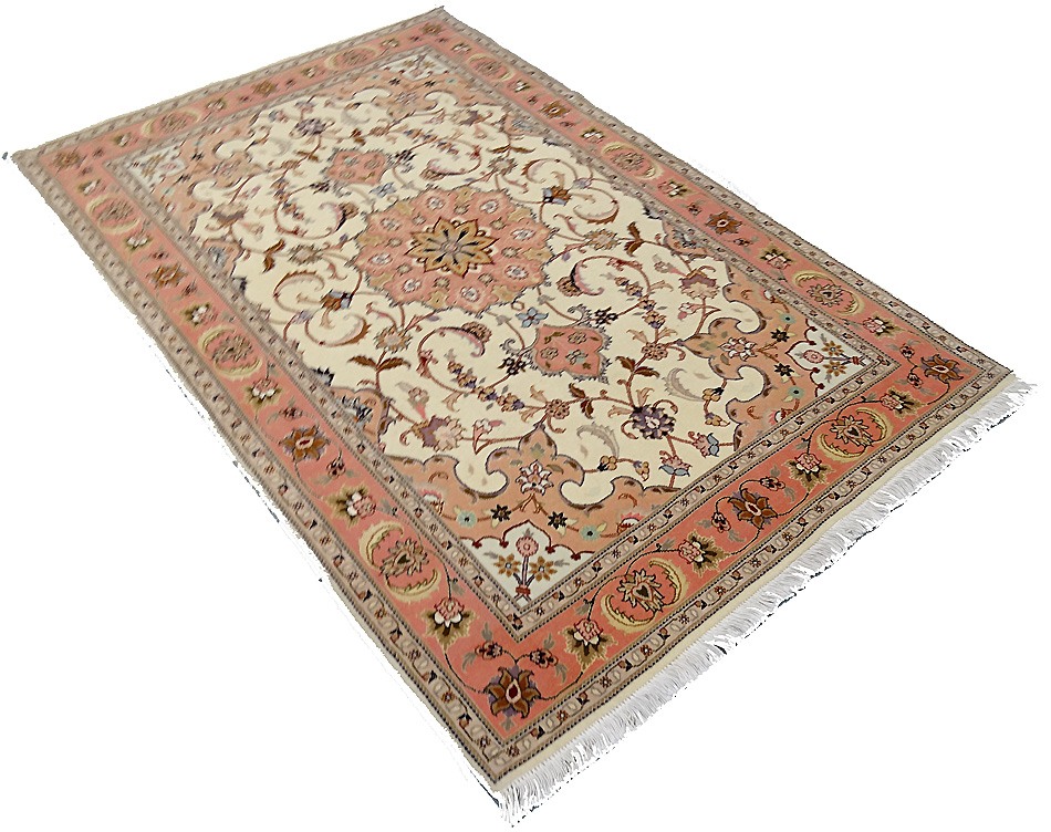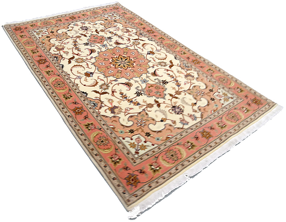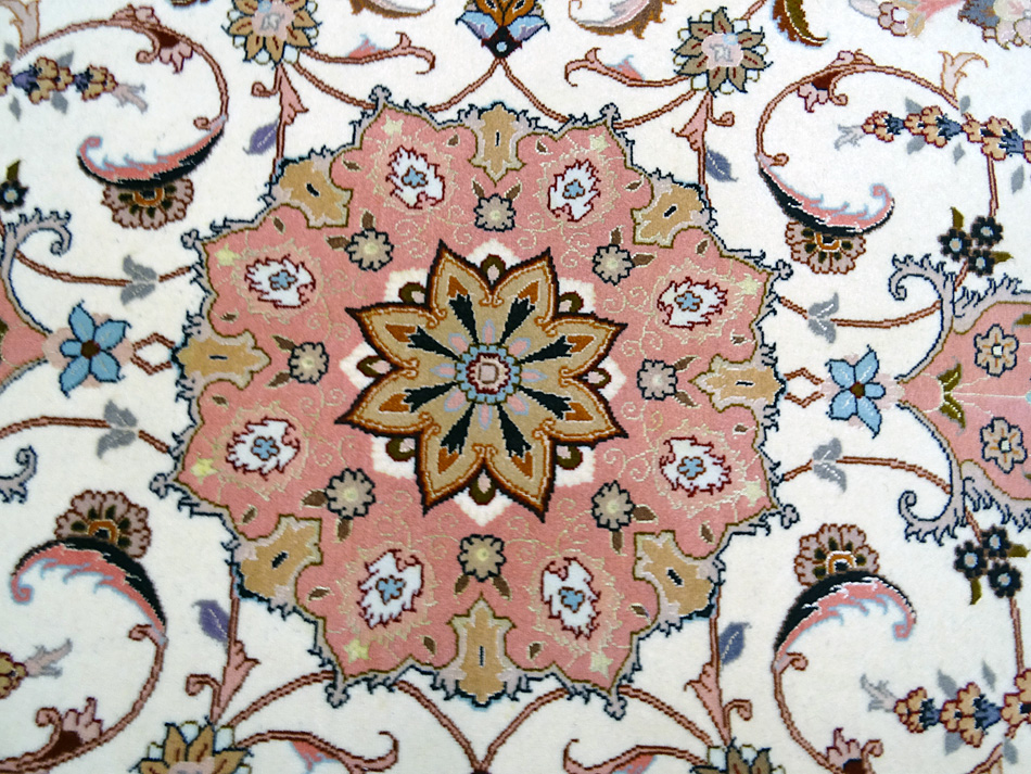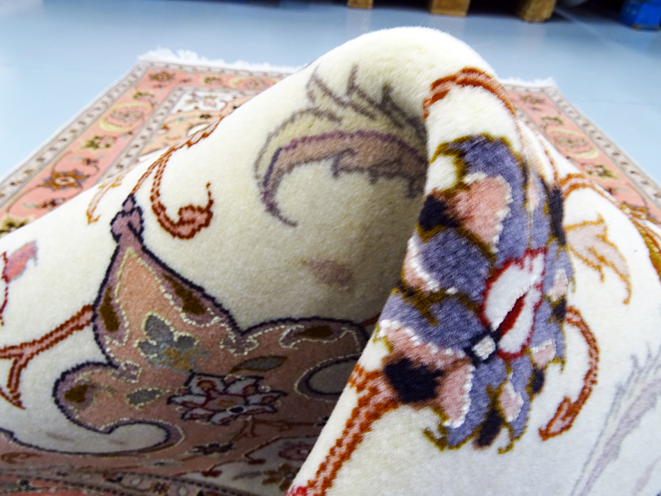 Dimensions : 150 x 103 cm -laine et soie- Pays Iran - Épaisseur : 8 mm - Densité de nouage : 800.000 Nœuds au m² - Surface : 1.55 m² - Poids : 3.86 Kgs - Age : contemporain - Confection : Noué main - Forme : Tapis de chambre - Type : Tapis persan