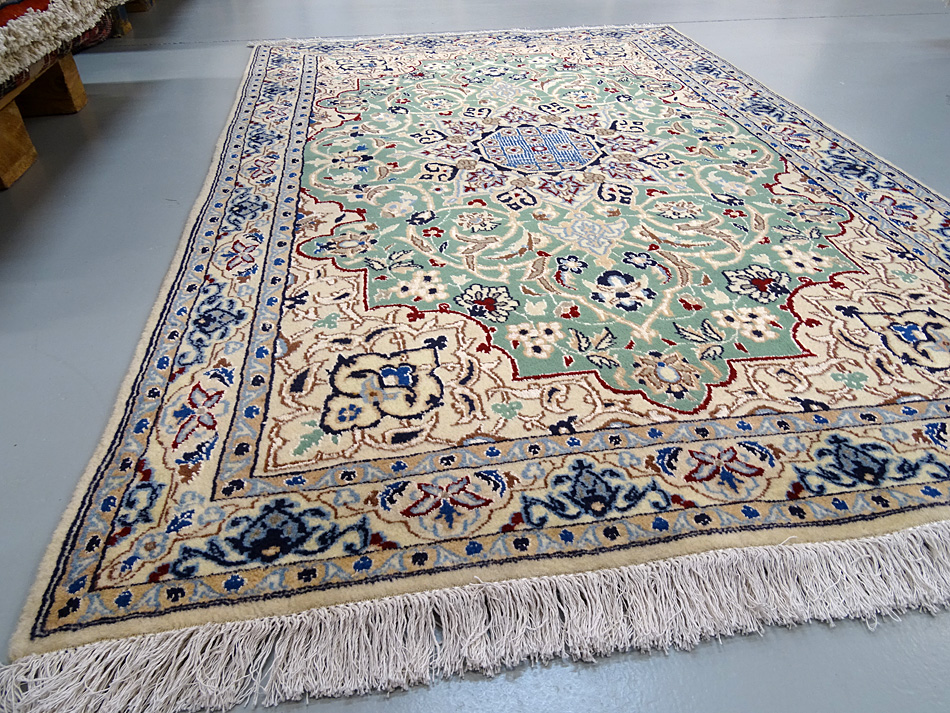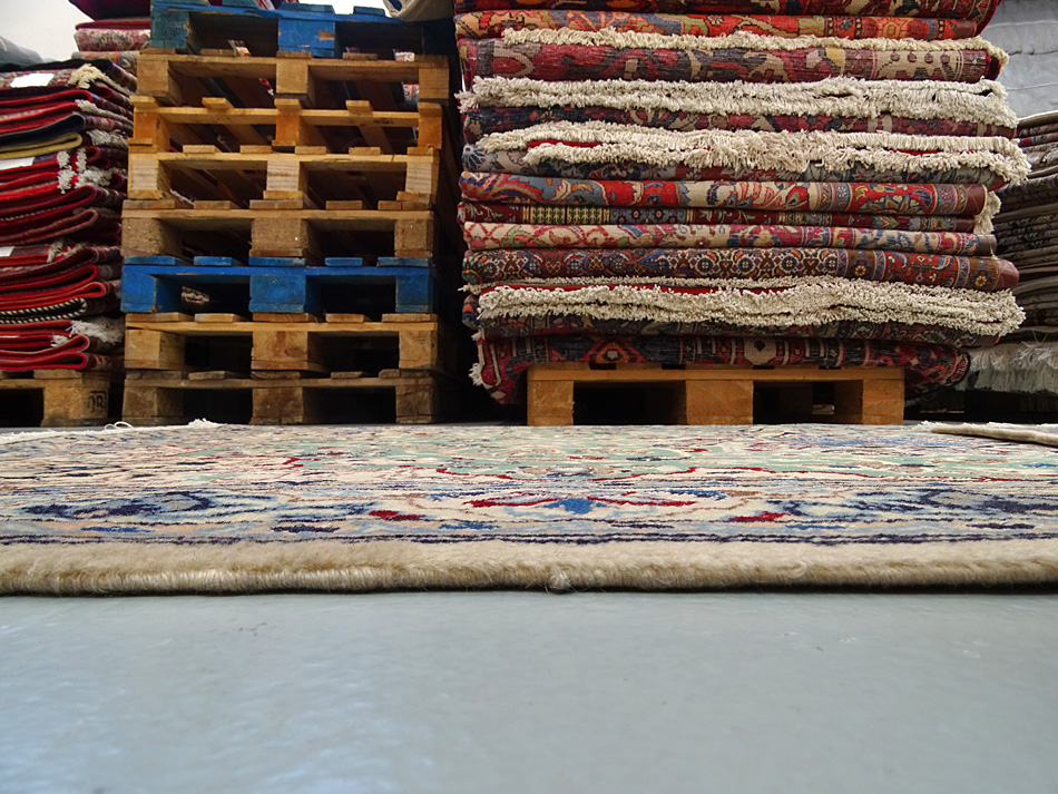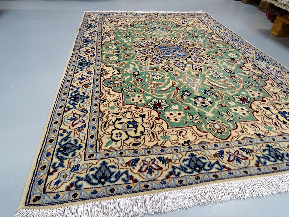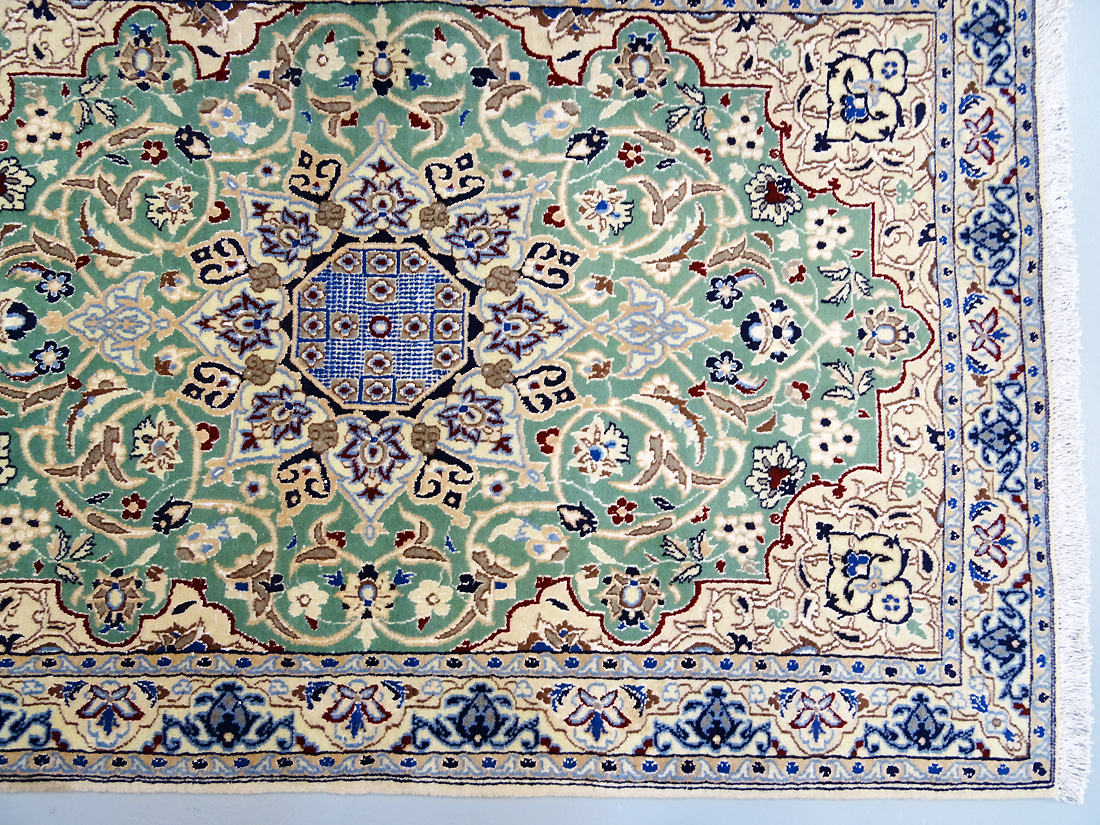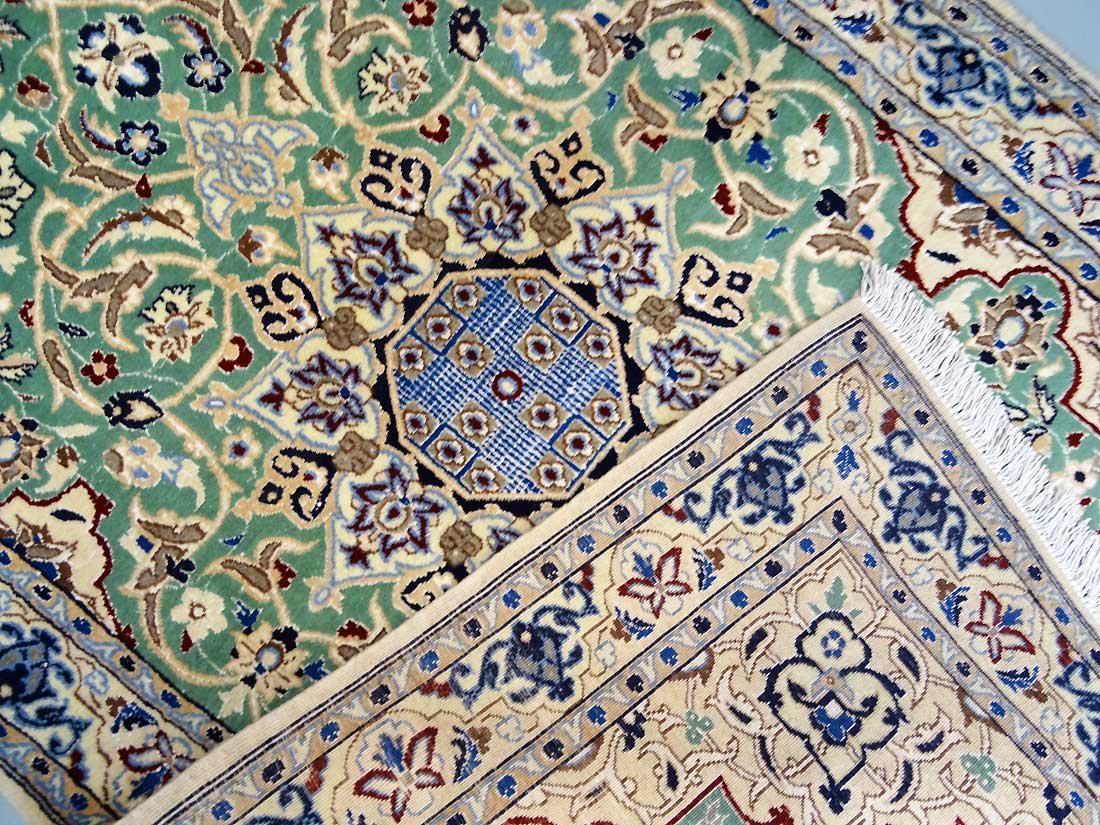 Dimensions : 145 x 96 cm -laine et soie- Pays Iran - Épaisseur : 9 mm - Densité de nouage : 360.000 Nœuds au m² - Surface : 1.39 m² - Poids : 3.48 Kgs - Age : contemporain - Confection : Noué main - Forme : Tapis de chambre - Type : Tapis persan