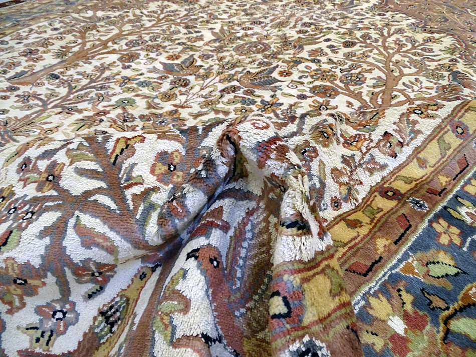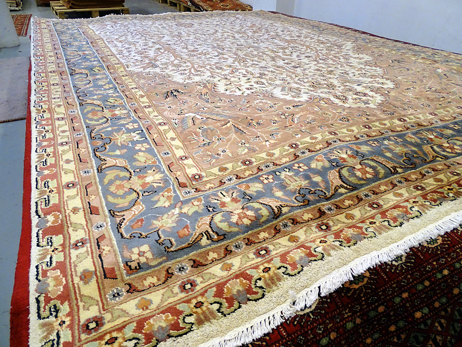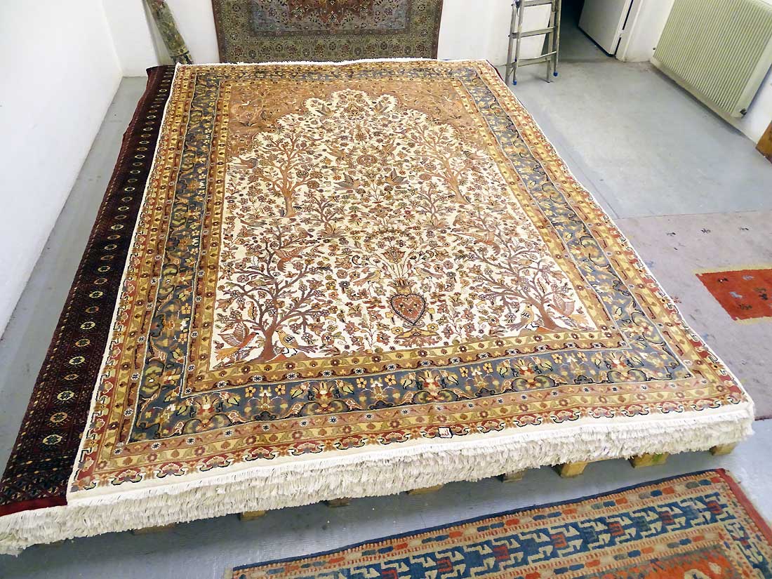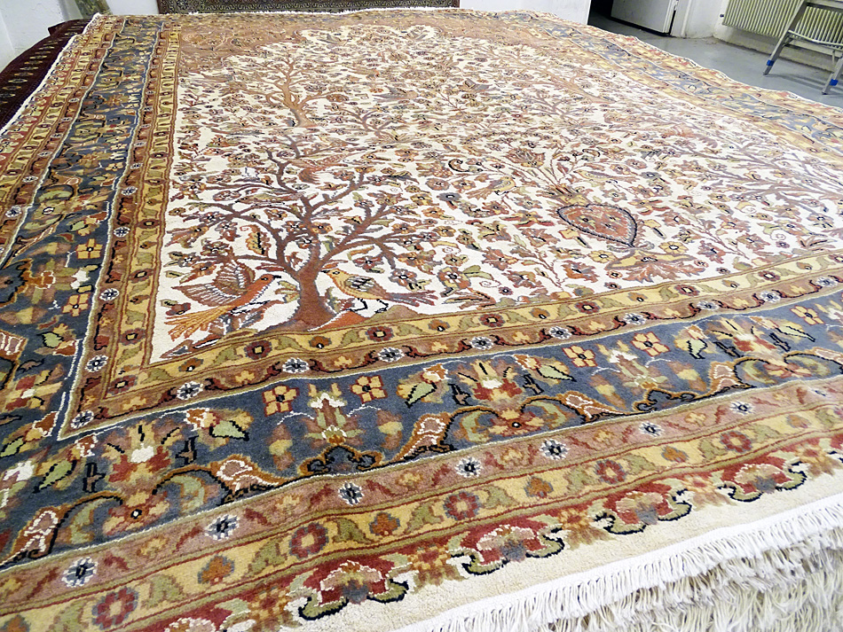 Dimensions : 360 x 280 cm -laine et soie- Pays Pakistan - Épaisseur : 7 mm - Densité de nouage : 200.000 Nœuds au m² - Surface : 10.08 m² - Poids : 25.2 Kgs - Age : contemporain - Confection : Noué main - Forme : Tapis de salon - Type : Tapis Oriental