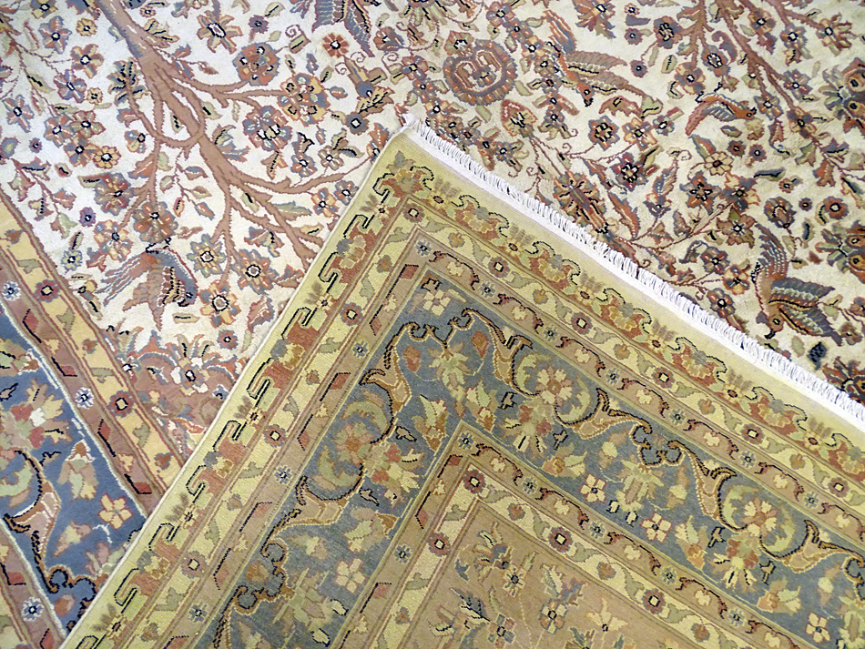Dimensions : 340 x 255 cm -laine et soie- Pays Pakistan - Épaisseur : 7 mm - Densité de nouage : 200.000 Nœuds au m² - Surface : 8.67 m² - Poids : 21.68 Kgs - Age : contemporain - Confection : Noué main - Forme : Tapis de salon - Type : Tapis Oriental