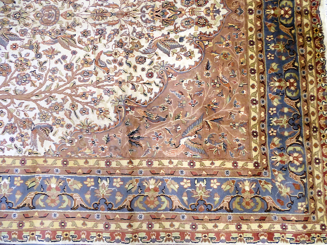 Dimensions : 326 x 255 cm -laine et soie- Pays Pakistan - Épaisseur : 7 mm - Densité de nouage : 200.000 Nœuds au m² - Surface : 8.31 m² - Poids : 20.78 Kgs - Age : contemporain - Confection : Noué main - Forme : Tapis de salon - Type : Tapis Oriental