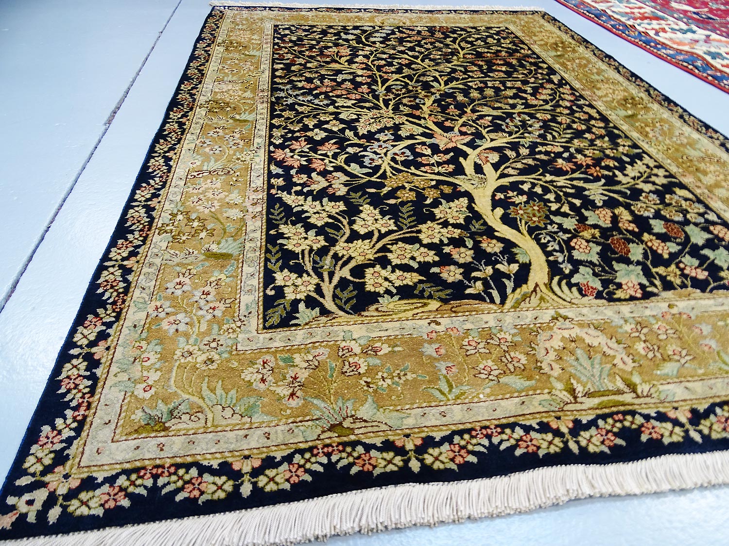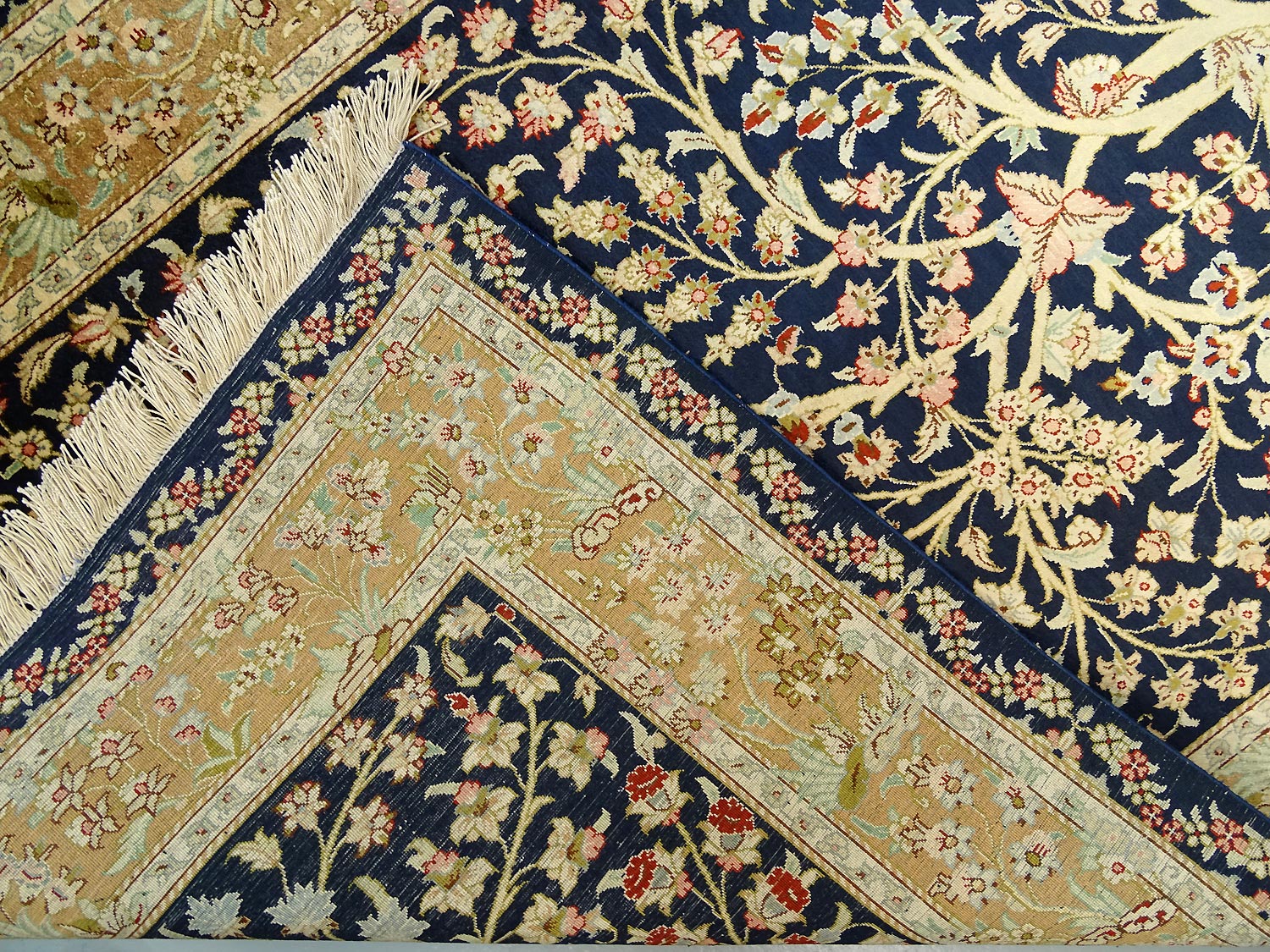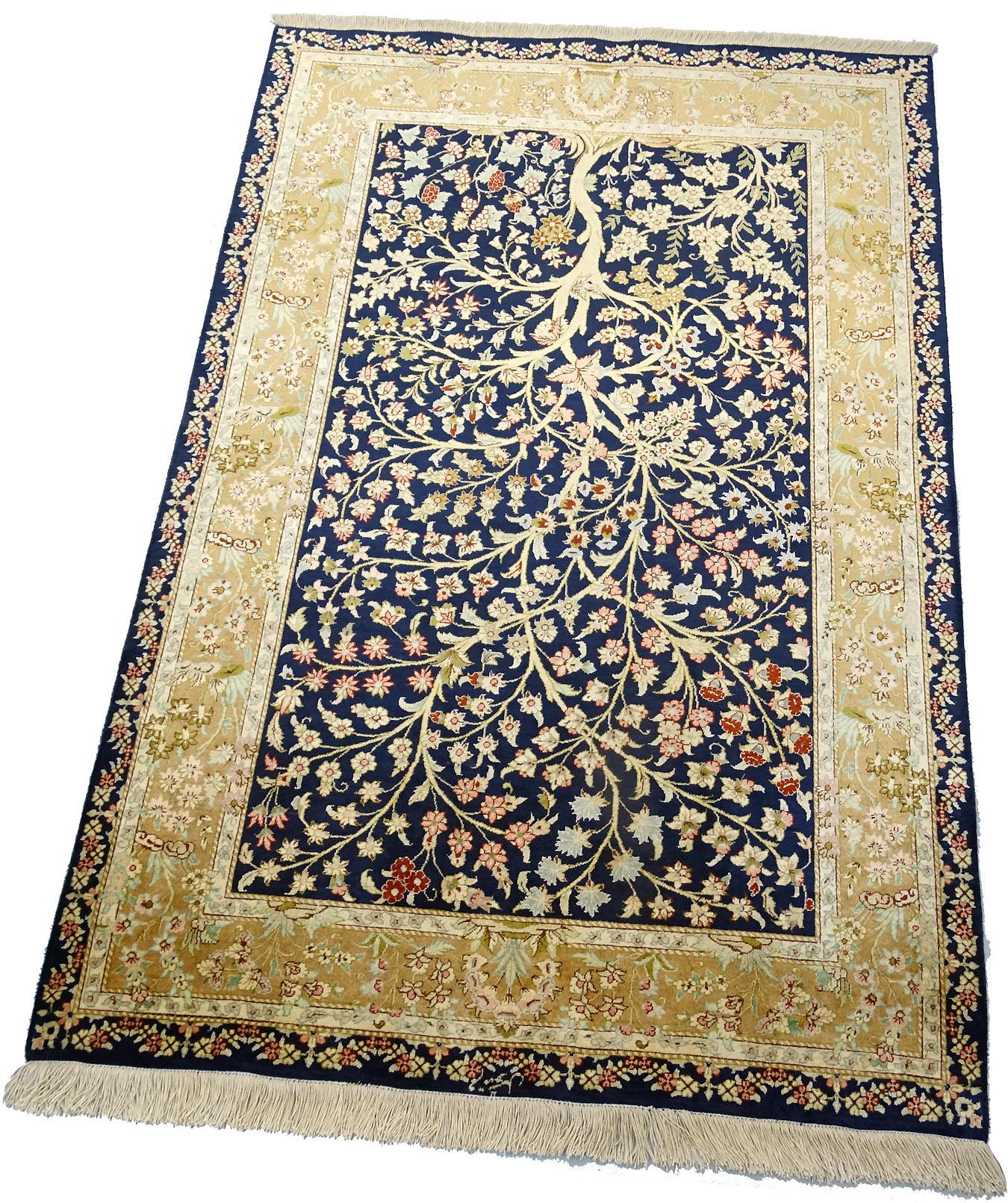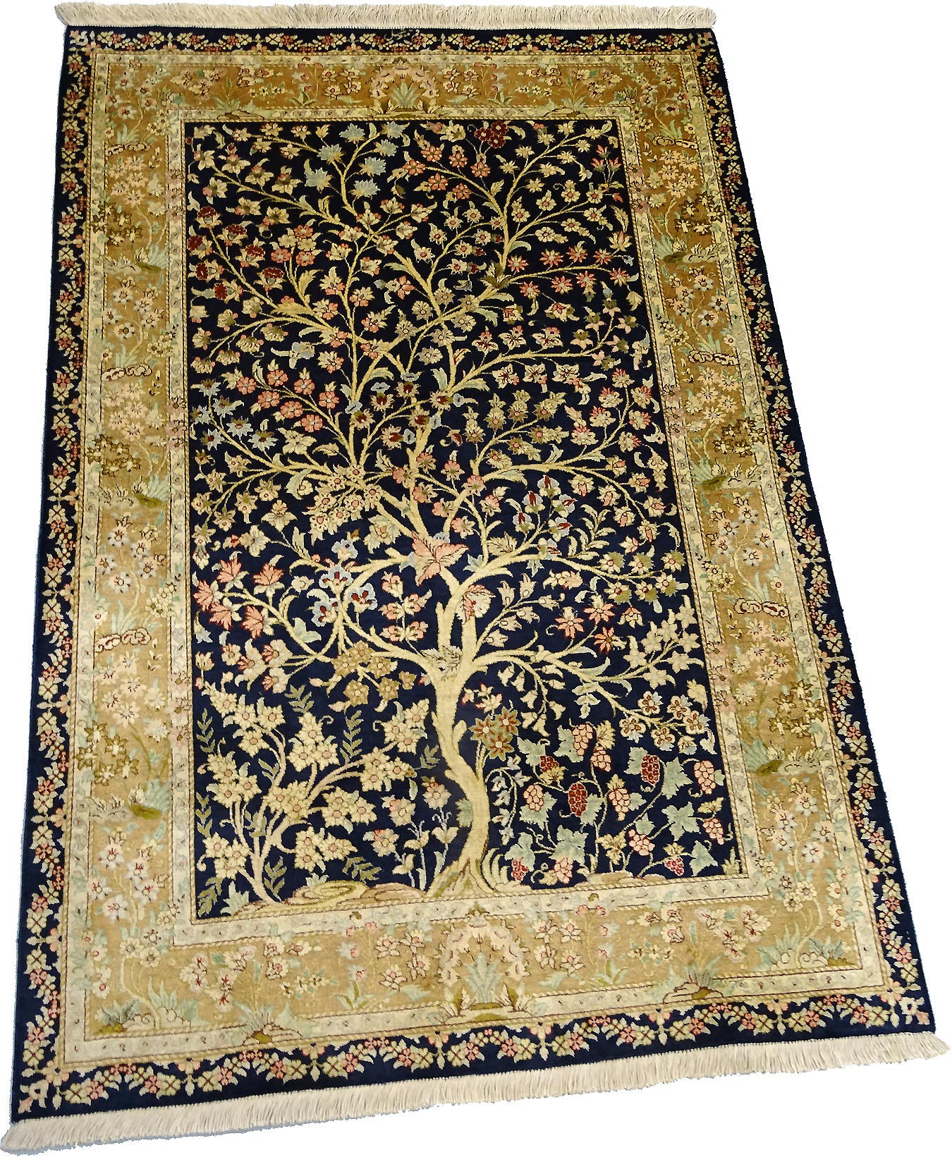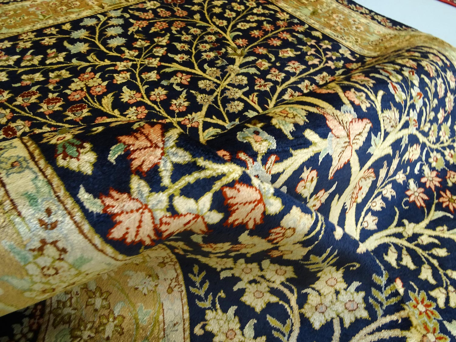Dimensions : 148 x 98 cm -soie- Pays Iran - Épaisseur : 3 mm - Densité de nouage : 1.000.000 Nœuds au m² - Surface : 1.45 m² - Poids : 2.9 Kgs - Age : contemporain - Confection : Noué main - Forme : Tapis de chambre - Type : Tapis persan