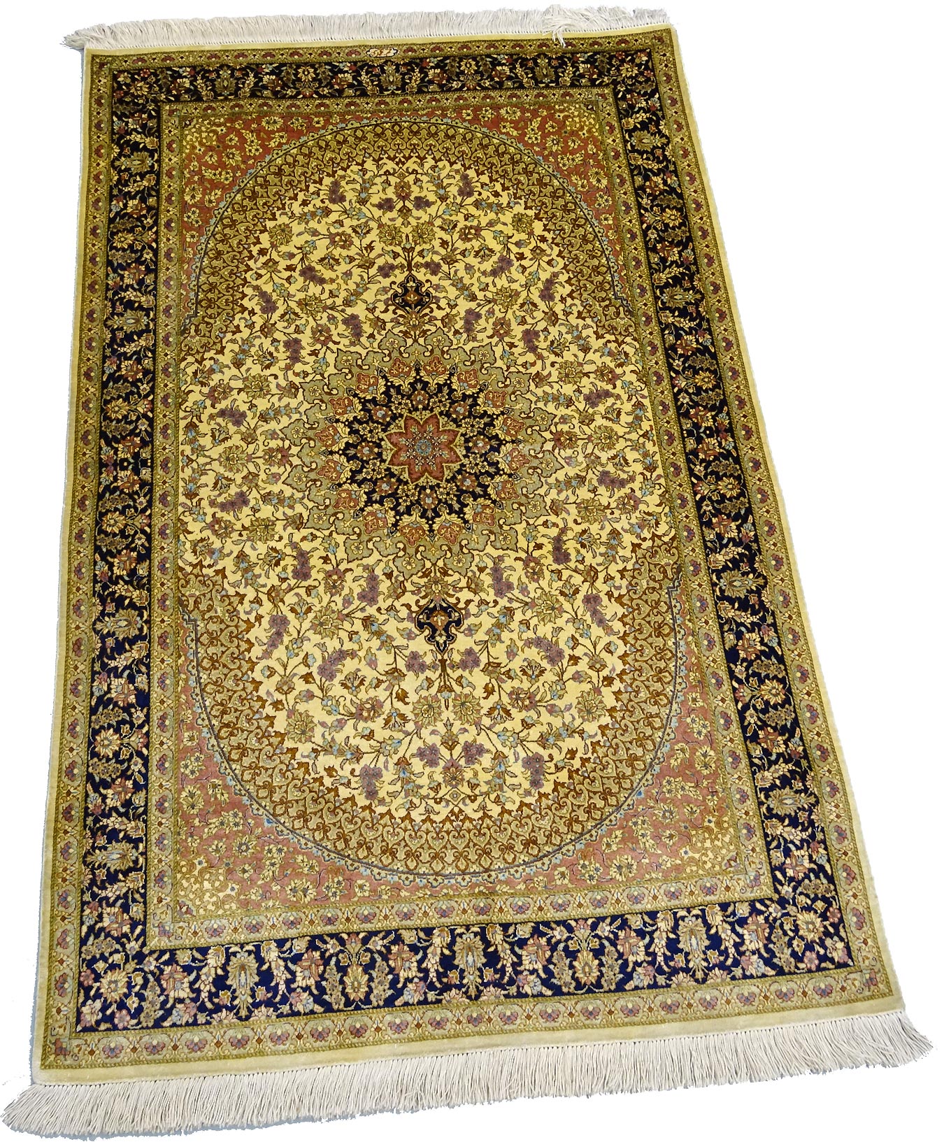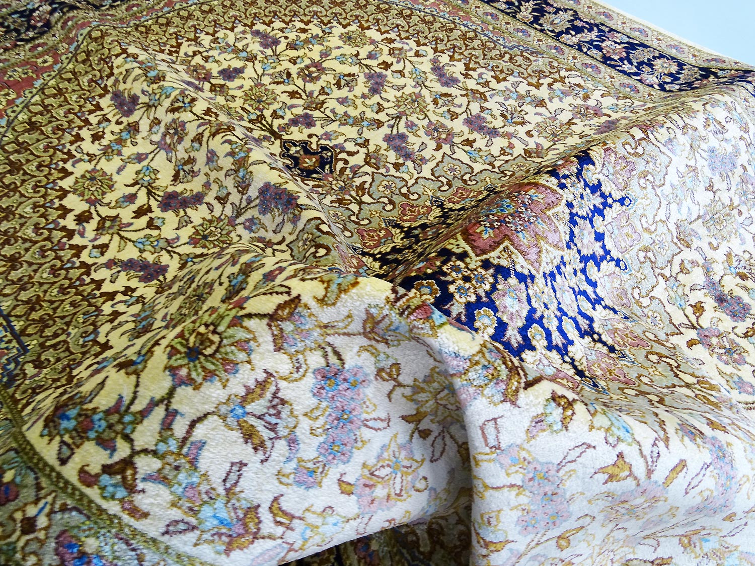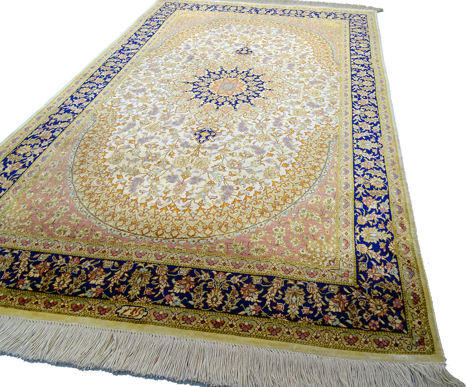Dimensions : 148 x 98 cm -soie- Pays Iran - Épaisseur : 3 mm - Densité de nouage : 1.000.000 Nœuds au m² - Surface : 1.45 m² - Poids : 2.9 Kgs - Age : contemporain - Confection : Noué main - Forme : Tapis de chambre - Type : Tapis persan