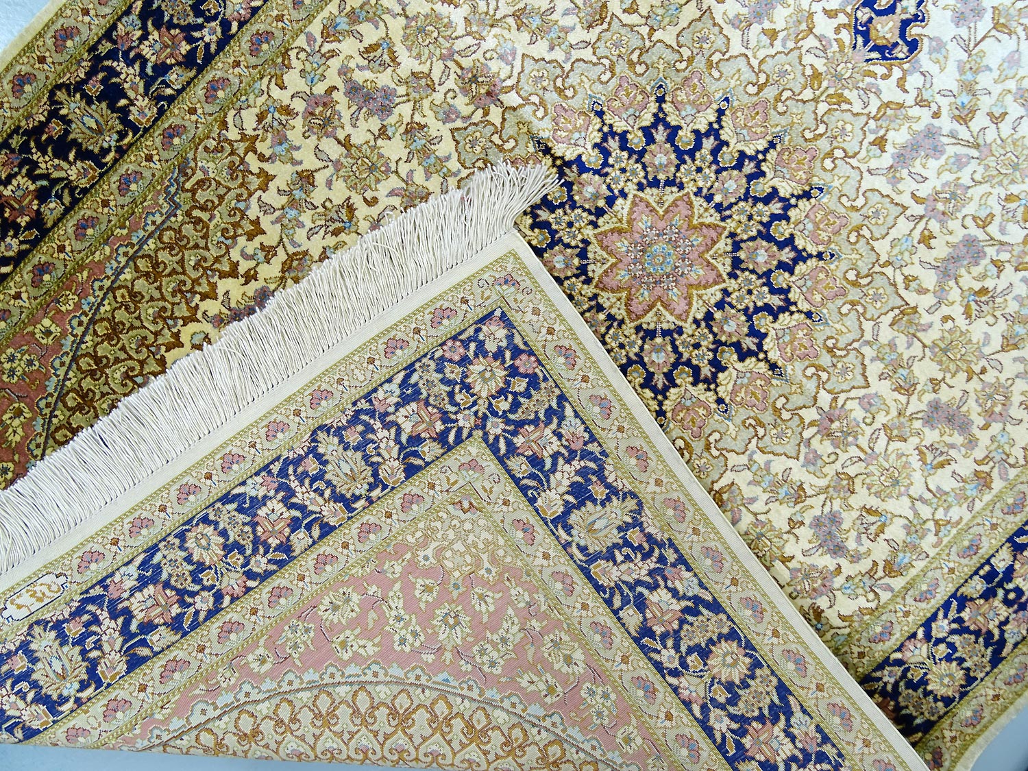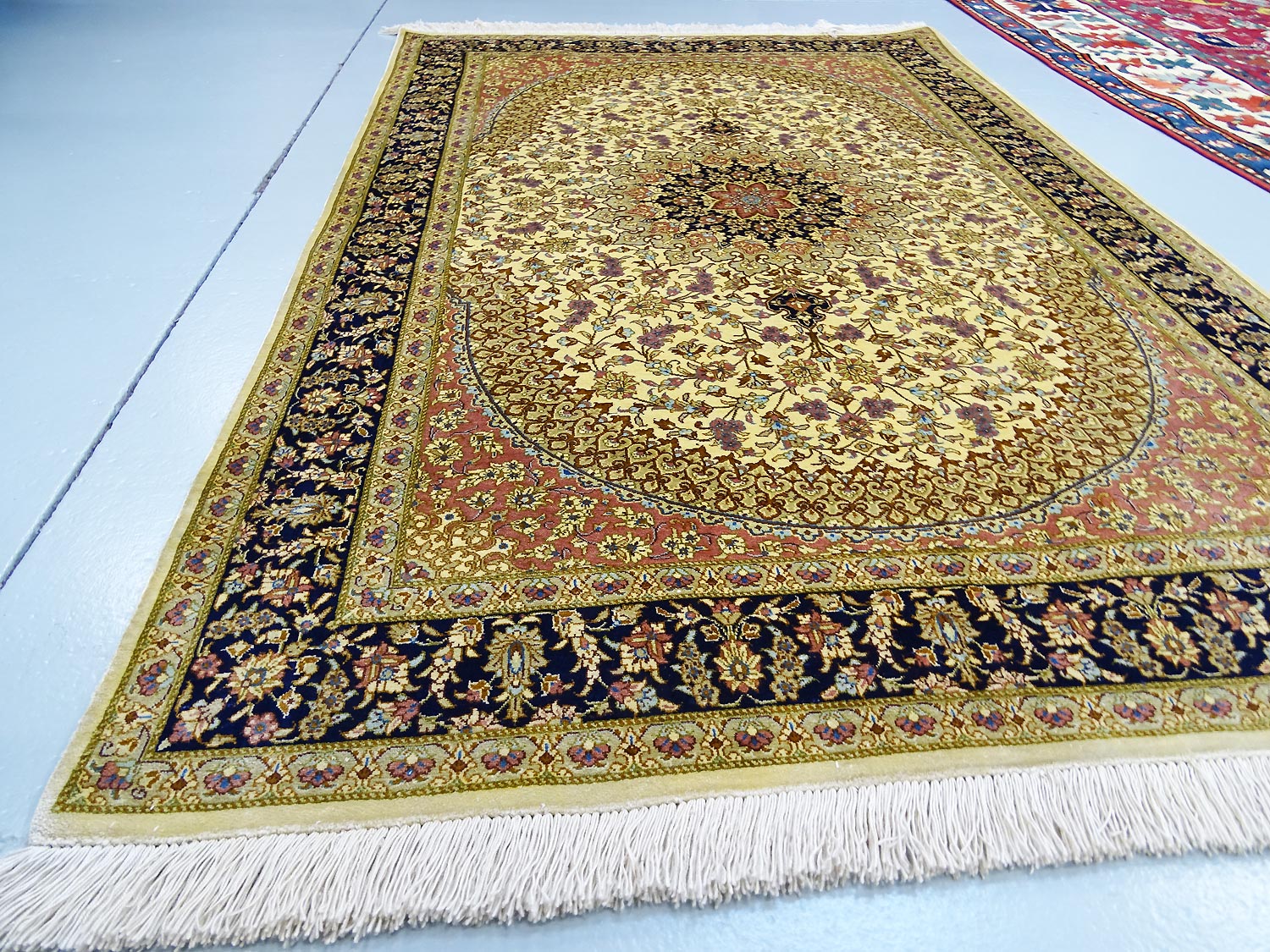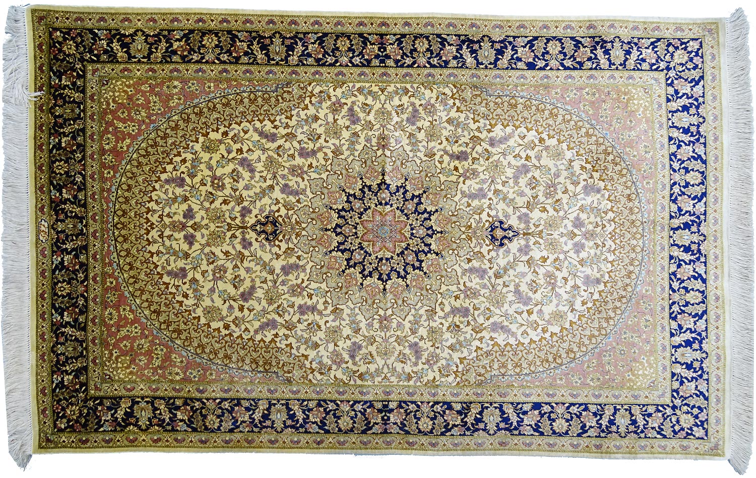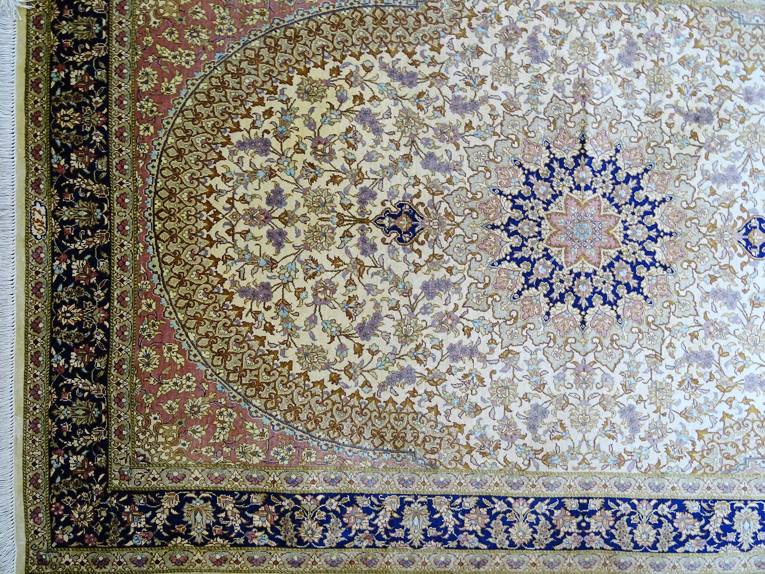 Dimensions : 148 x 98 cm -soie- Pays Iran - Épaisseur : 3 mm - Densité de nouage : 1.000.000 Nœuds au m² - Surface : 1.45 m² - Poids : 2.9 Kgs - Age : contemporain - Confection : Noué main - Forme : Tapis de chambre - Type : Tapis persan
