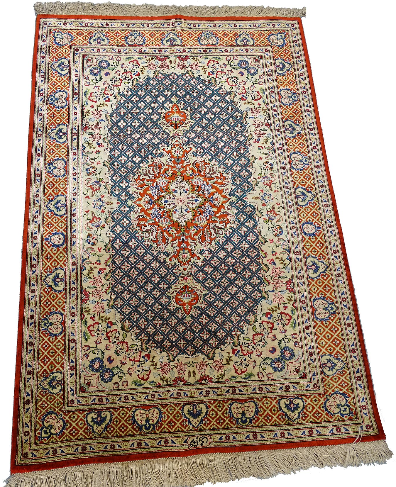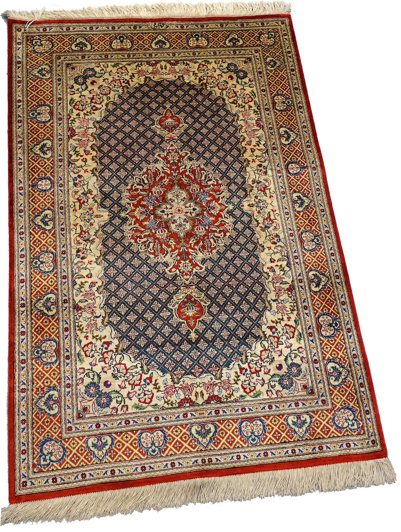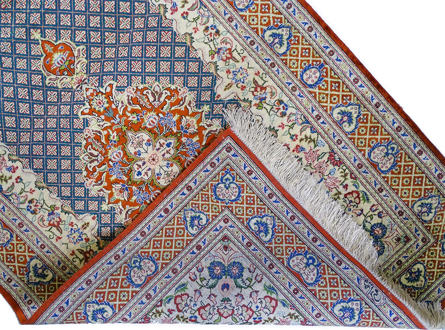 Dimensions : 115 x 77 cm -soie- Pays Iran - Épaisseur : 3 mm - Densité de nouage : 1.000.000 Nœuds au m² - Surface : 0.89 m² - Poids : 1.77 Kgs - Age : contemporain - Confection : Noué main - Forme : Tapis de chambre - Type : Tapis persan