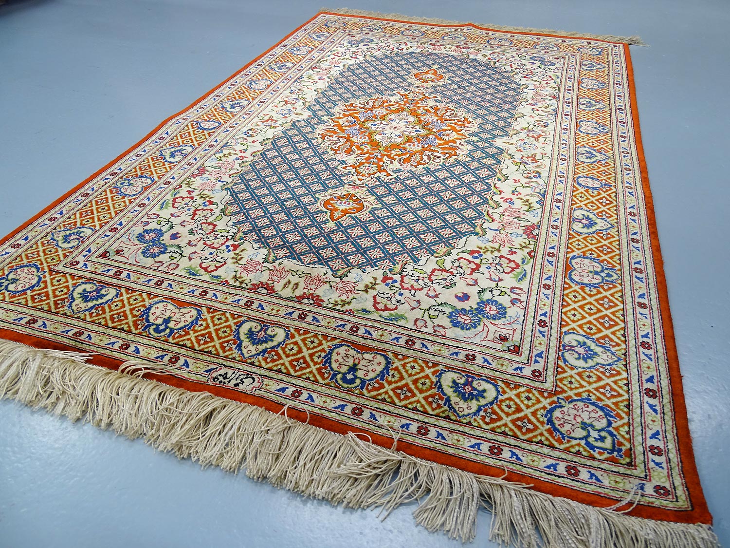 Dimensions : 120 x 78 cm -soie- Pays Iran - Épaisseur : 3 mm - Densité de nouage : 1.000.000 Nœuds au m² - Surface : 0.94 m² - Poids : 1.87 Kgs - Age : contemporain - Confection : Noué main - Forme : Tapis de chambre - Type : Tapis persan