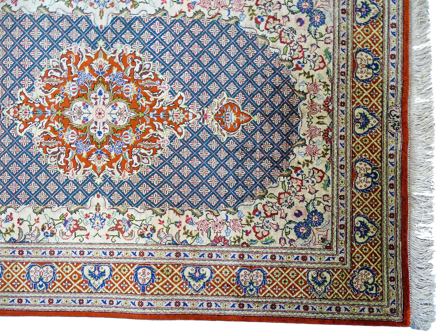 Dimensions : 115 x 76 cm -soie- Pays Iran - Épaisseur : 3 mm - Densité de nouage : 1.000.000 Nœuds au m² - Surface : 0.87 m² - Poids : 1.75 Kgs - Age : contemporain - Confection : Noué main - Forme : Tapis de chambre - Type : Tapis persan