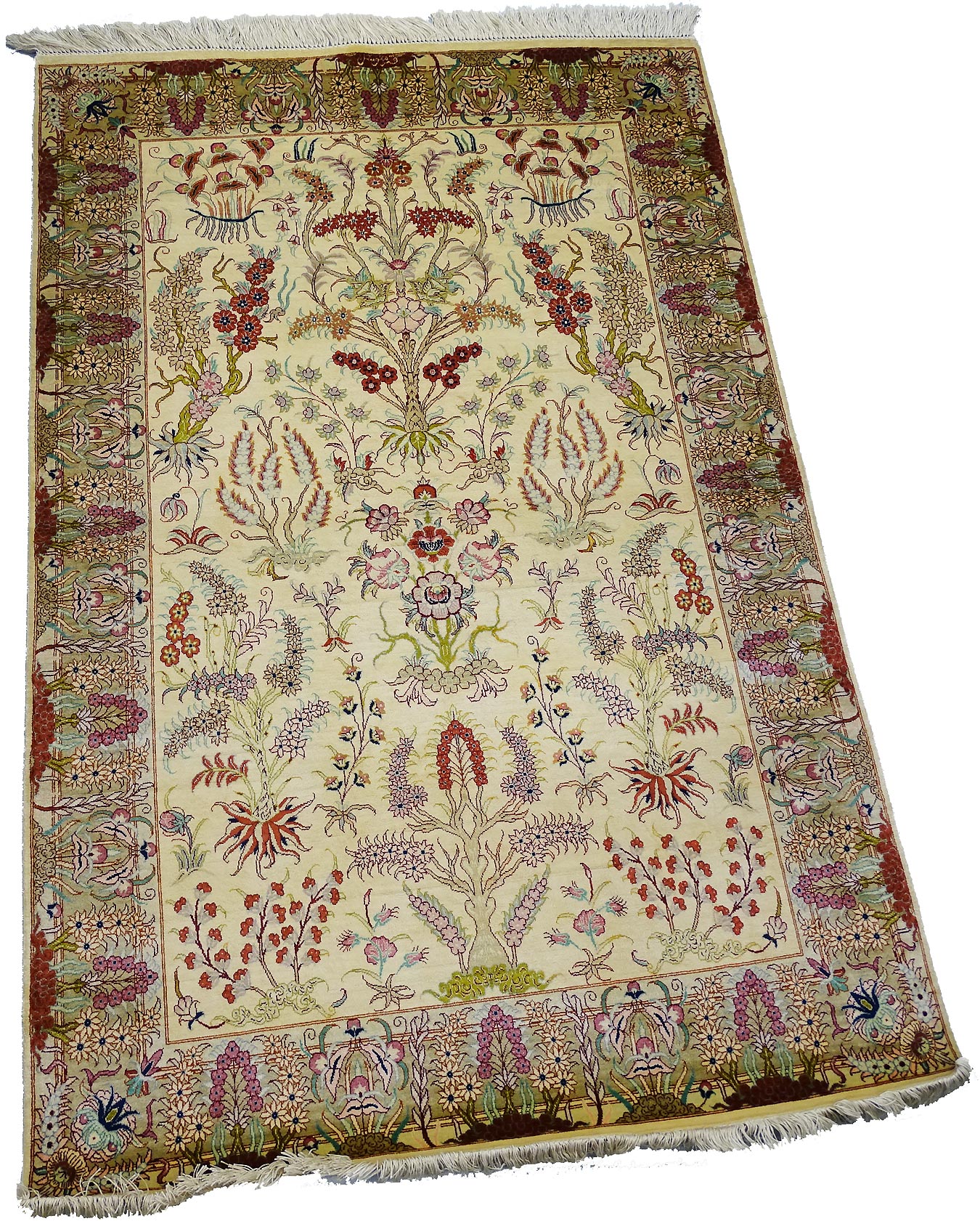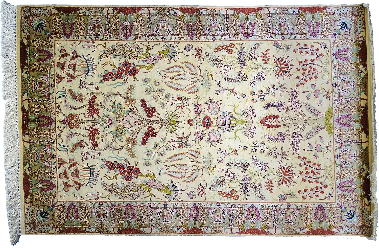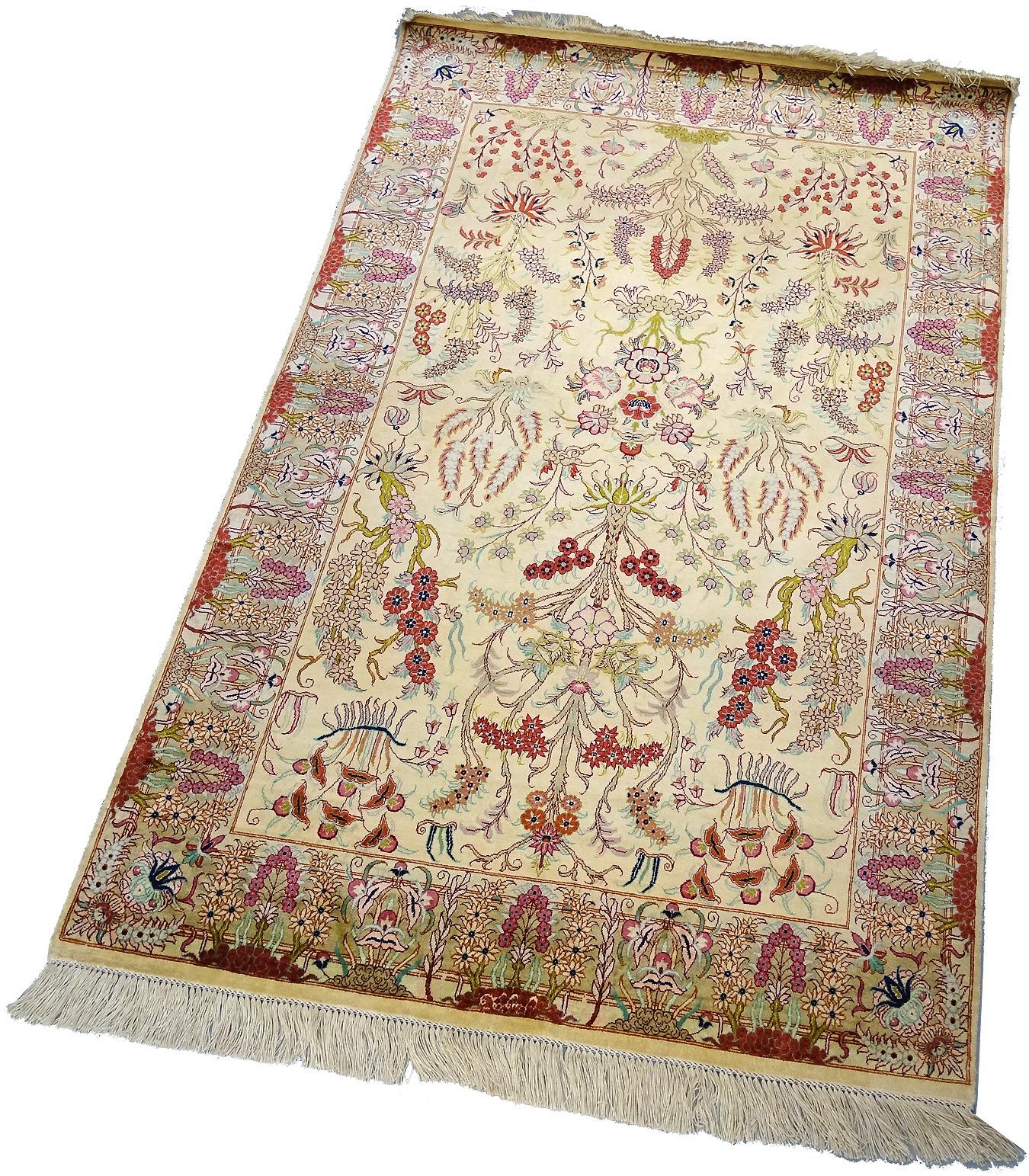 Dimensions : 148 x 98 cm -soie- Pays Iran - Épaisseur : 3 mm - Densité de nouage : 1.000.000 Nœuds au m² - Surface : 1.45 m² - Poids : 2.9 Kgs - Age : contemporain - Confection : Noué main - Forme : Tapis de chambre - Type : Tapis persan
