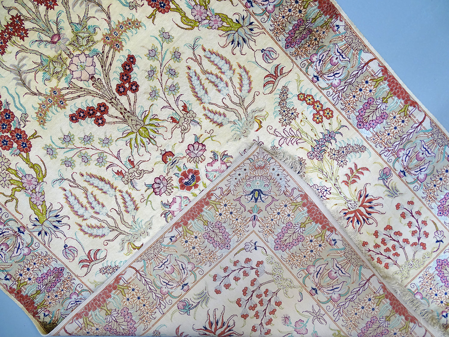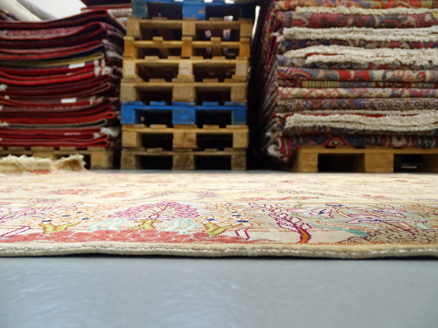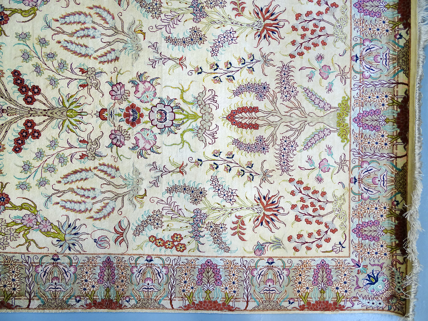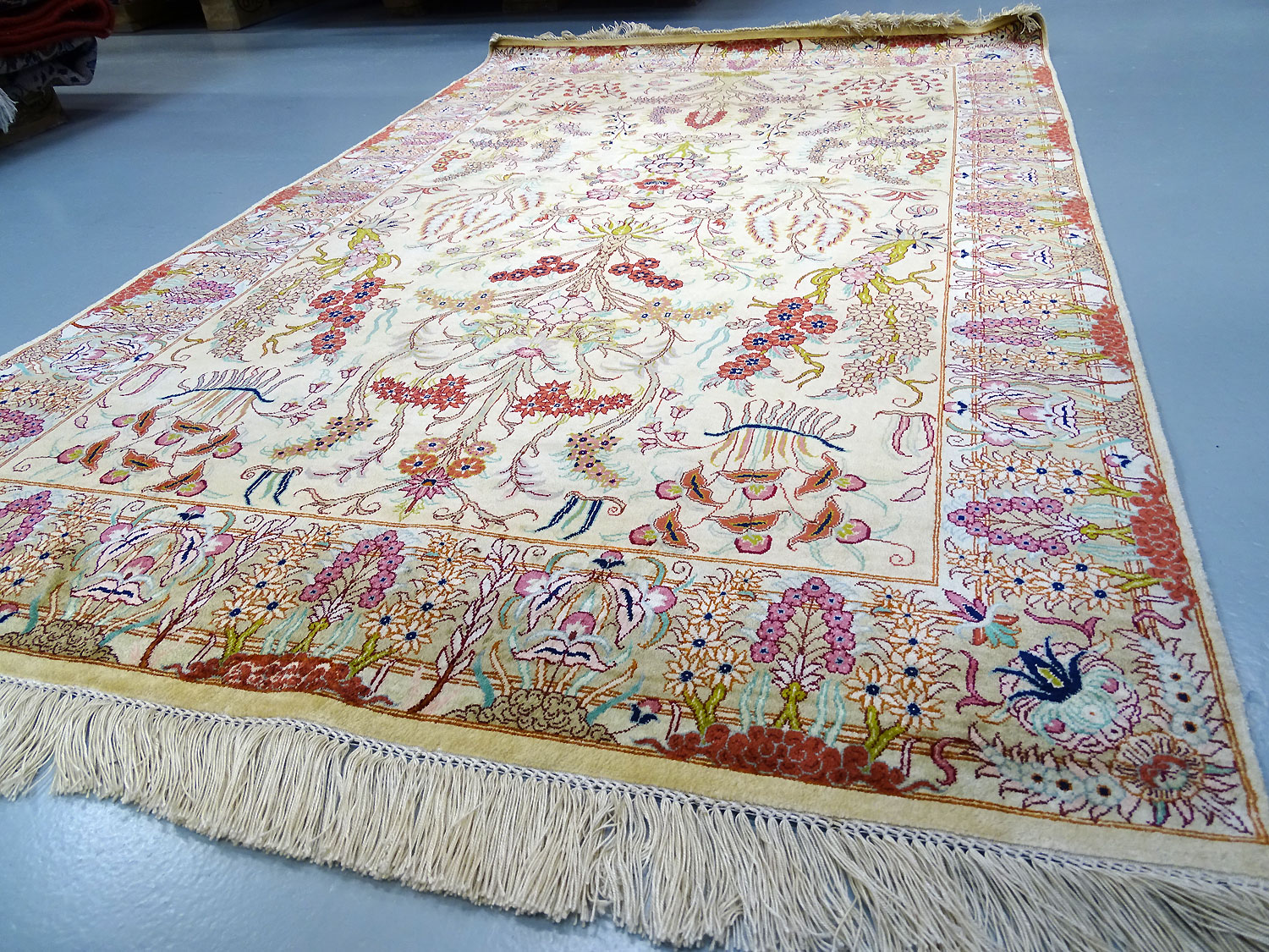 Dimensions : 148 x 98 cm -soie- Pays Iran - Épaisseur : 3 mm - Densité de nouage : 1.000.000 Nœuds au m² - Surface : 1.45 m² - Poids : 2.9 Kgs - Age : contemporain - Confection : Noué main - Forme : Tapis de chambre - Type : Tapis persan