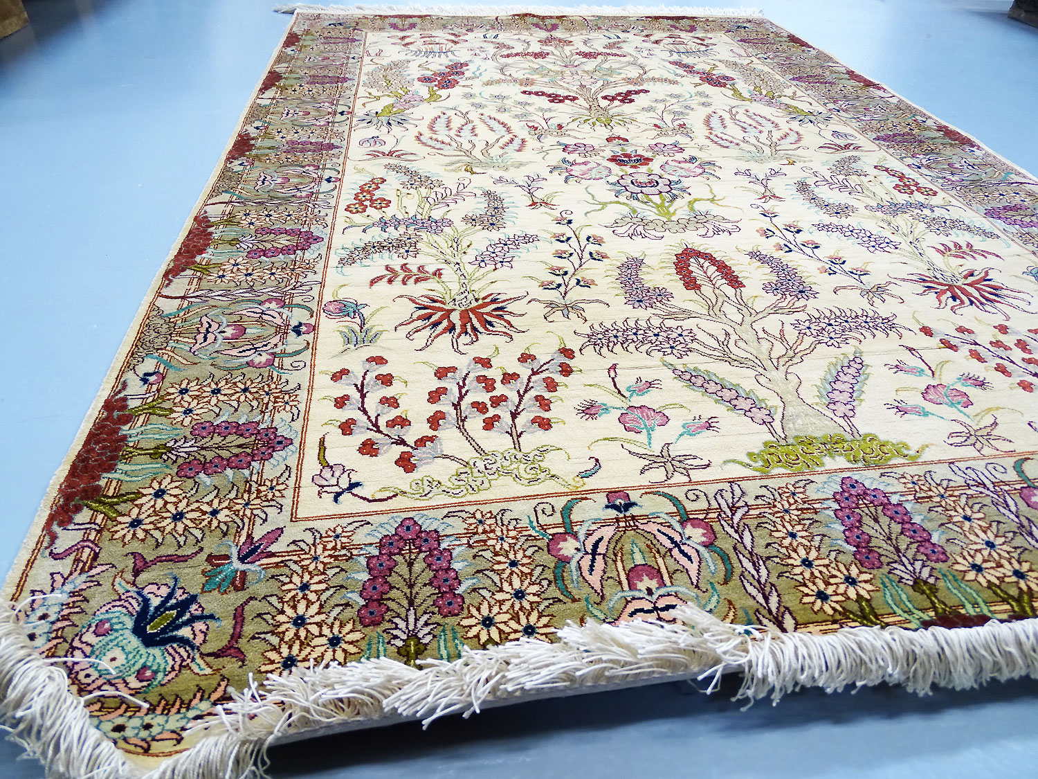 Dimensions : 160 x 100 cm -soie- Pays Iran - Épaisseur : 3 mm - Densité de nouage : 1.000.000 Nœuds au m² - Surface : 1.6 m² - Poids : 3.2 Kgs - Age : contemporain - Confection : Noué main - Forme : Tapis de chambre - Type : Tapis persan