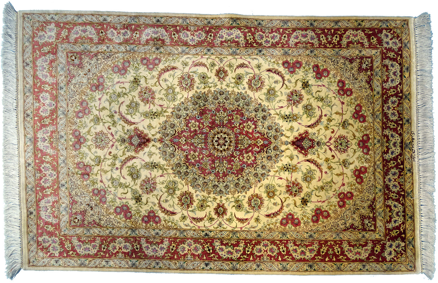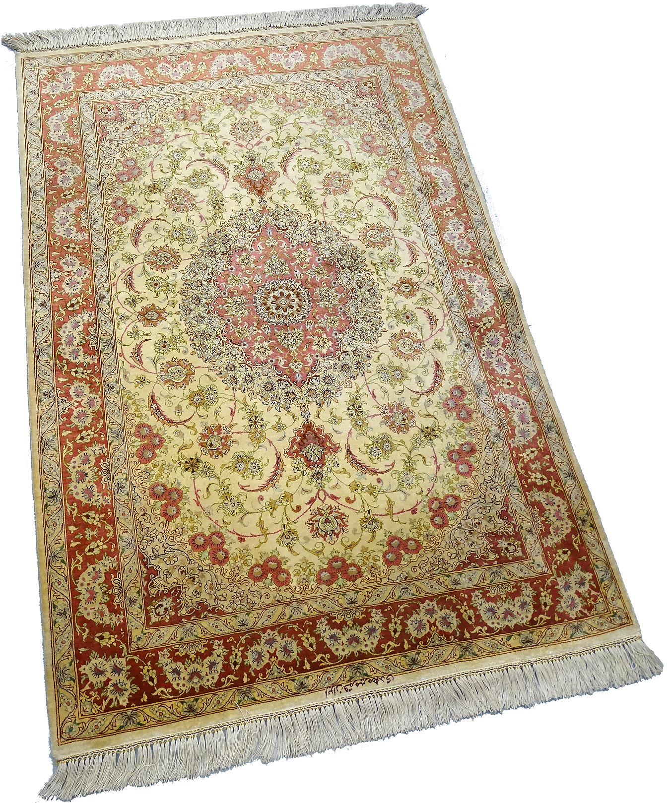 Dimensions : 150 x 102 cm -soie- Pays Iran - Épaisseur : 3 mm - Densité de nouage : 1.000.000 Nœuds au m² - Surface : 1.53 m² - Poids : 3.06 Kgs - Age : contemporain - Confection : Noué main - Forme : Tapis de chambre - Type : Tapis persan
