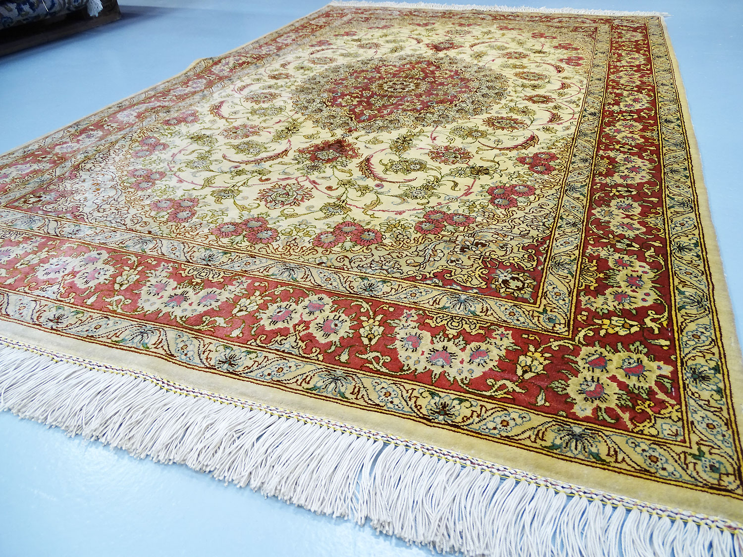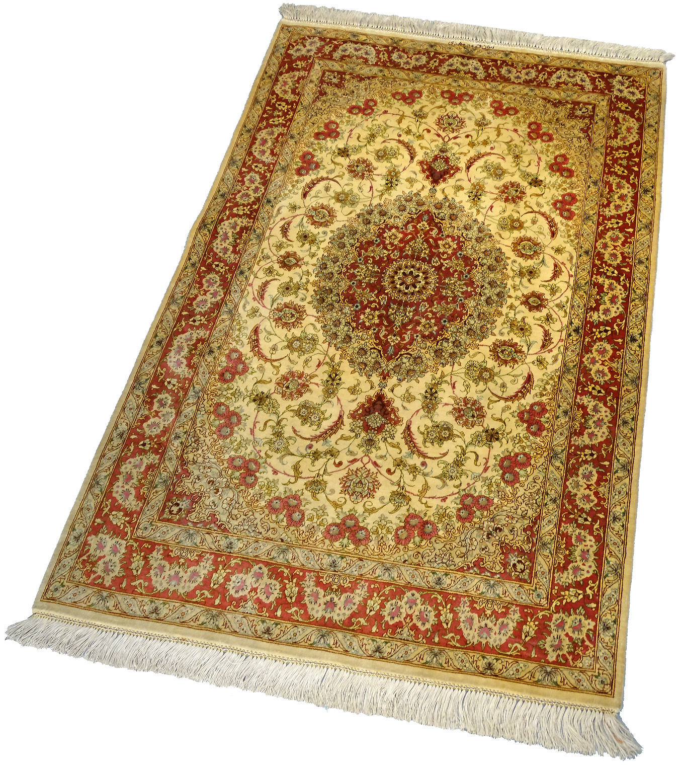 Dimensions : 148 x 97 cm -soie- Pays Iran - Épaisseur : 3 mm - Densité de nouage : 1.000.000 Nœuds au m² - Surface : 1.44 m² - Poids : 2.87 Kgs - Age : contemporain - Confection : Noué main - Forme : Tapis de chambre - Type : Tapis persan