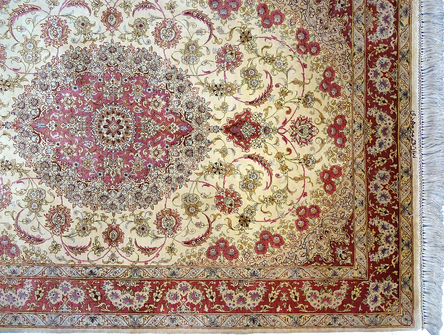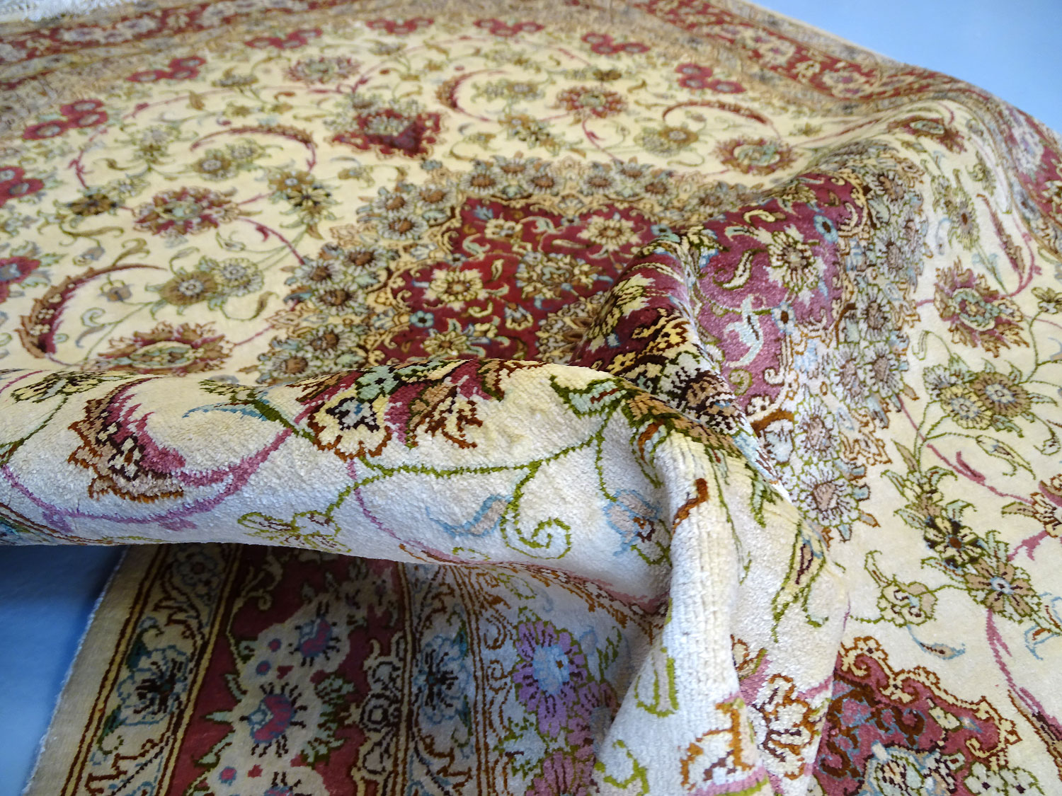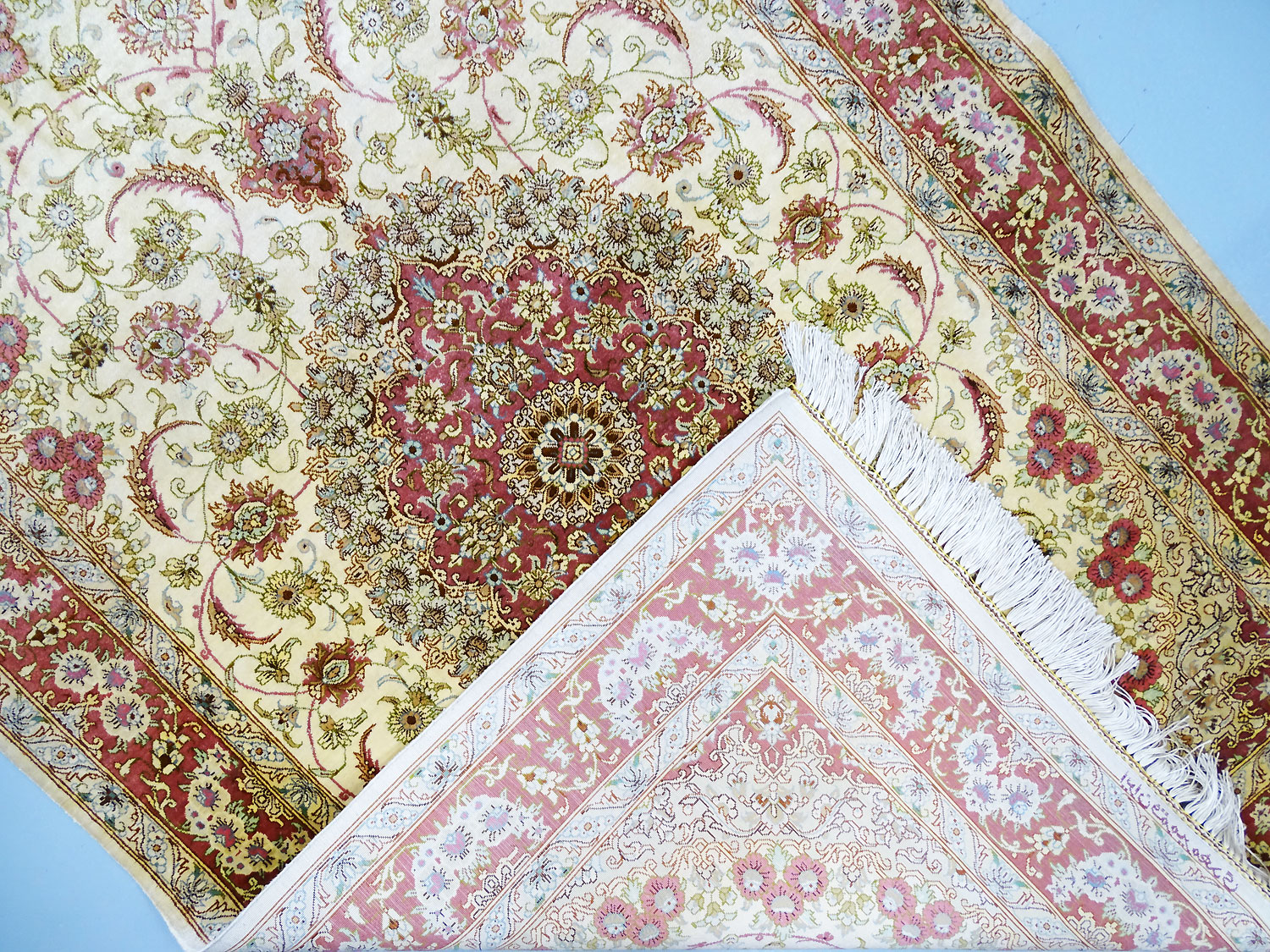 Dimensions : 148 x 98 cm -soie- Pays Iran - Épaisseur : 3 mm - Densité de nouage : 1.000.000 Nœuds au m² - Surface : 1.45 m² - Poids : 2.9 Kgs - Age : contemporain - Confection : Noué main - Forme : Tapis de chambre - Type : Tapis persan